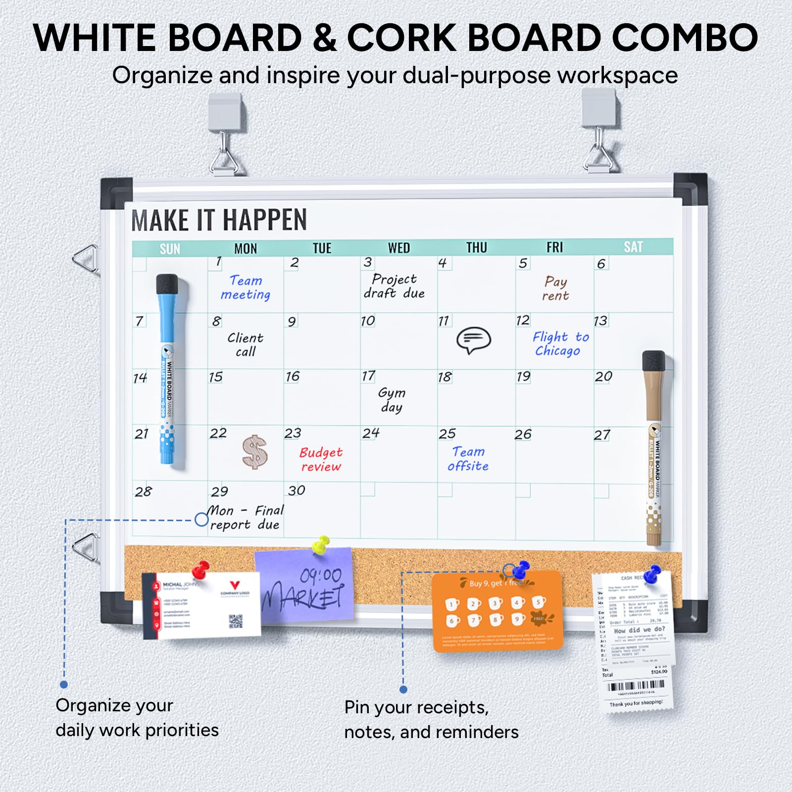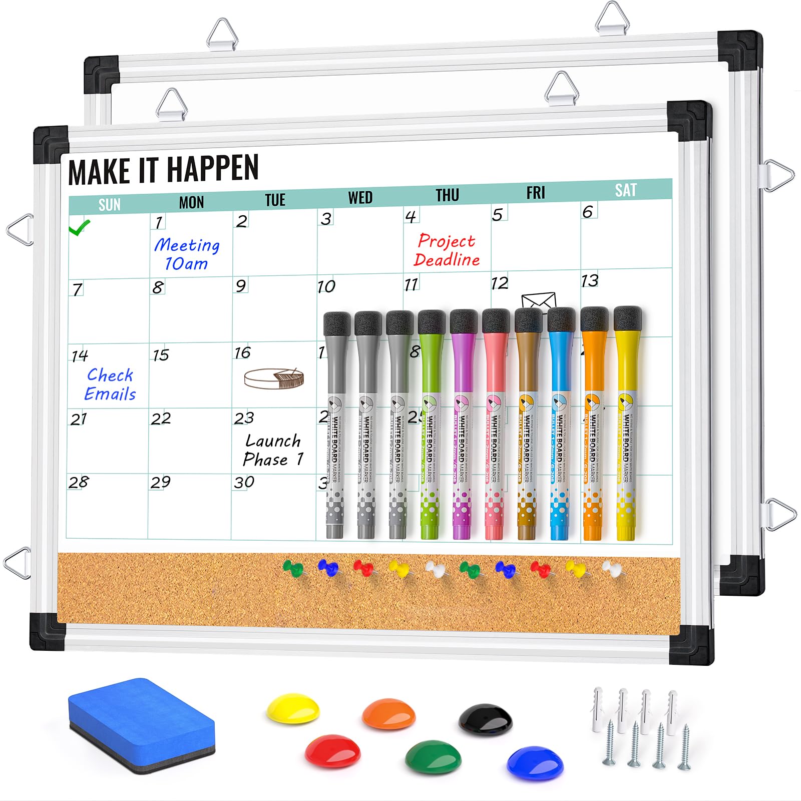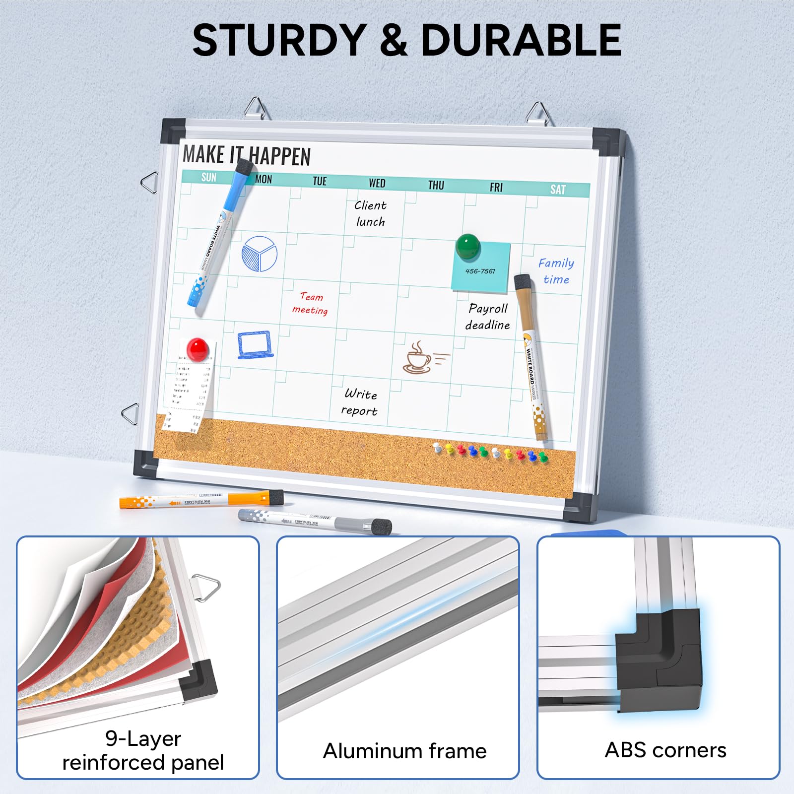Marsrock マンスリーカレンダーホワイトボードとコルクボードコンボ 壁用 17インチ x 13インチ リバーシブルハンギングホワイトボード両面ホワイトボード アルミフレーム付き 計画、オフィス、キッチン、学校、自宅用