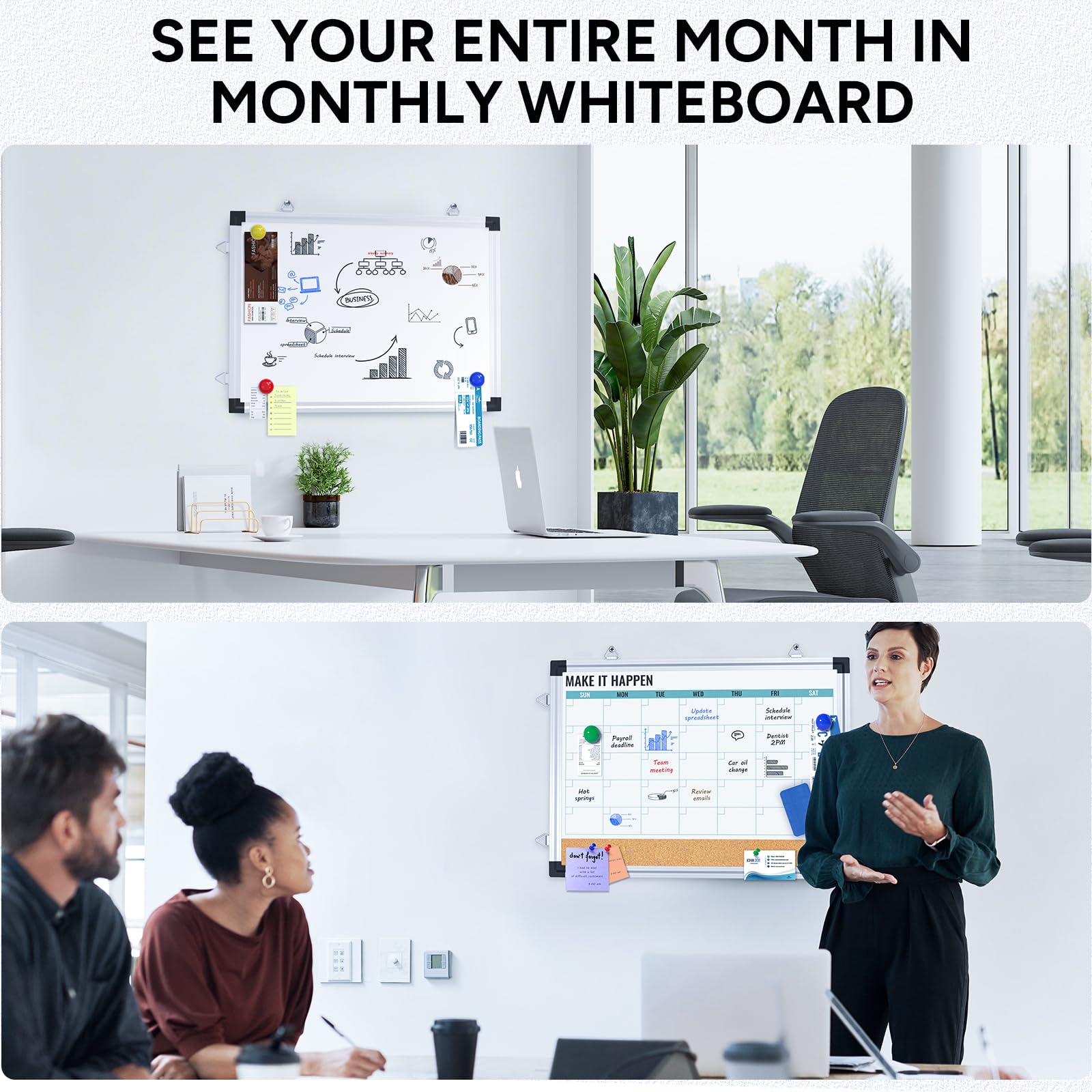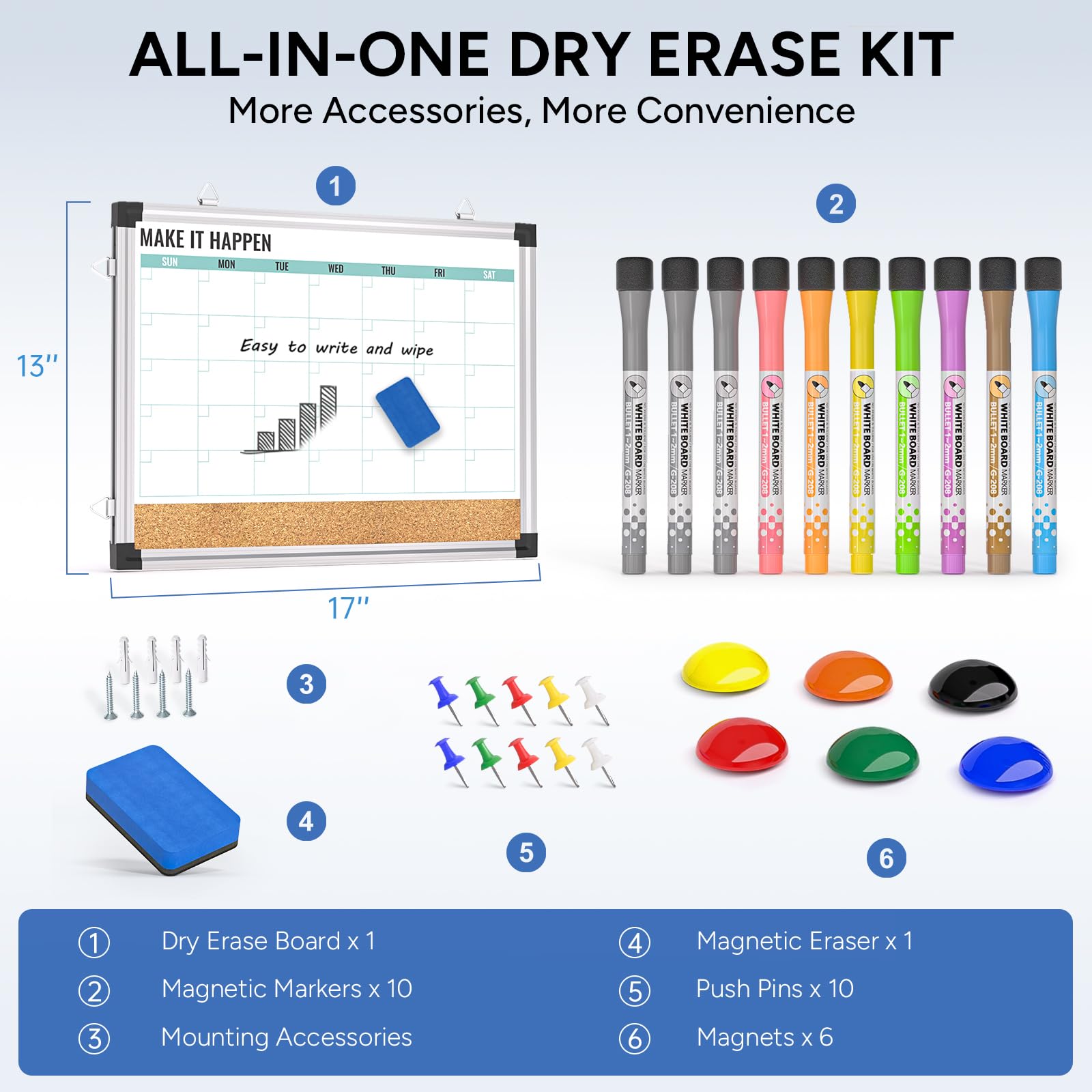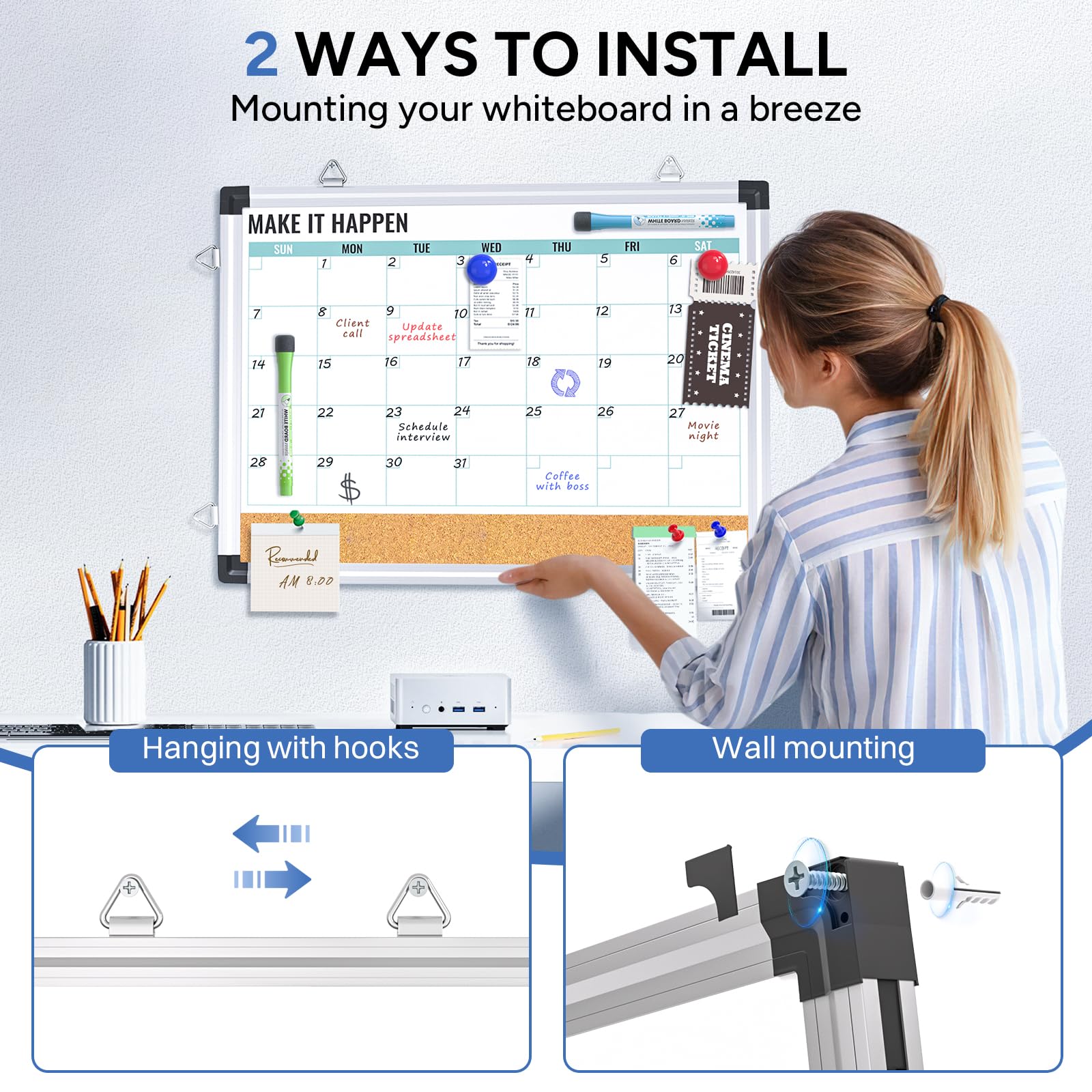 Marsrock マンスリーカレンダーホワイトボードとコルクボードコンボ 壁用 17インチ x 13インチ リバーシブルハンギングホワイトボード両面ホワイトボード アルミフレーム付き 計画、オフィス、キッチン、学校、自宅用