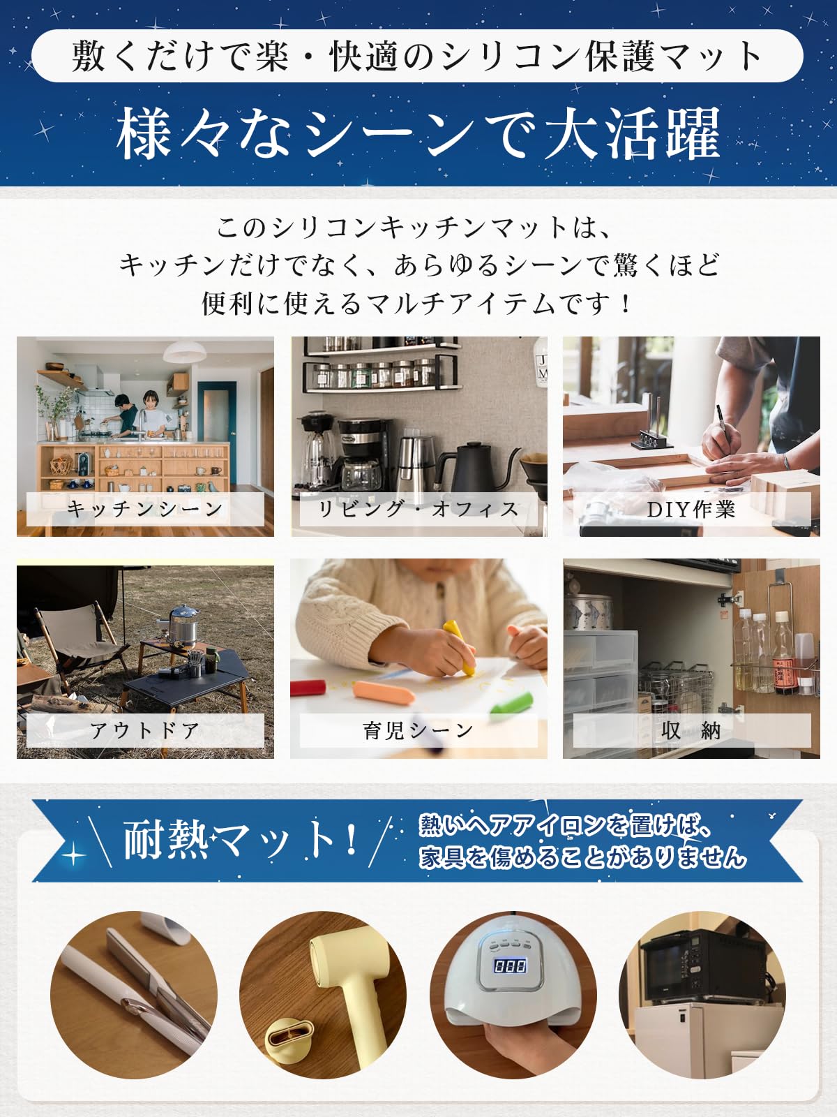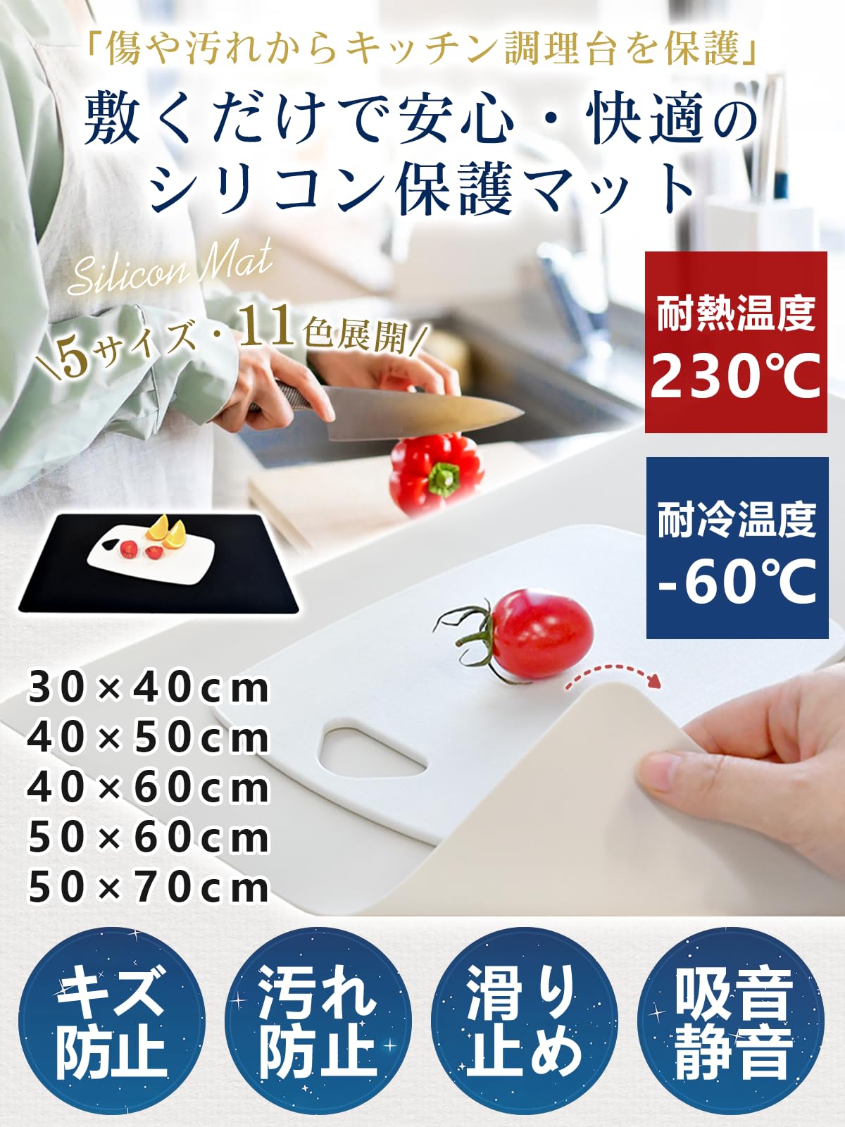 シリコンマット キッチン 調理台用 【耐熱230℃・耐冷-60℃・滑り止め・静音】 大判 保護シート 人工大理石対応 防汚 傷防止 カウンター 作業台 シンクマット 台所用 Silicone Mat (50×70cm, 生成色)