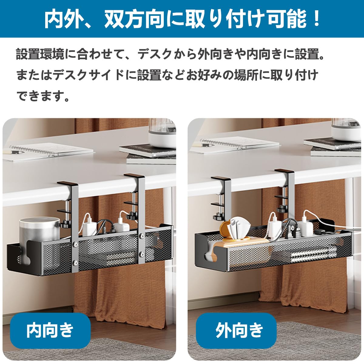 ELECTRO-WEIDEWORLD ケーブルトレー デスク下 メッシュ 配線隠し ケーブル収納 穴あけ不要 外向き 内向き 両対応 かんたん設置 炭素鋼 テーブル下収納ラック 天板0.4〜5.2cm設置可能 ルーター収納 文房具 デスク周り 収納 小物収納 (黒, M(39*12*7cm)+L(40*13*7cm)二個セット)