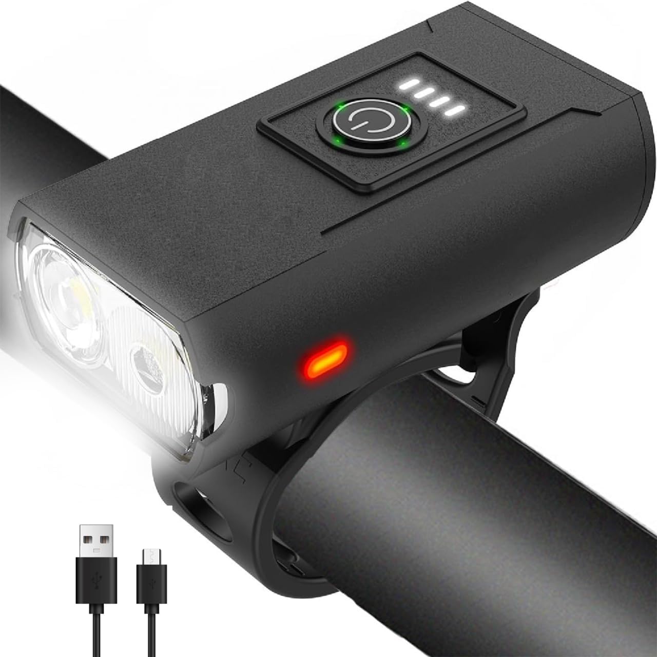 USB充電式LEDバイクライト、3モード、バッテリー残量表示、フロント&リアライト付き、自転車用防水ヘッドライト、ブラック