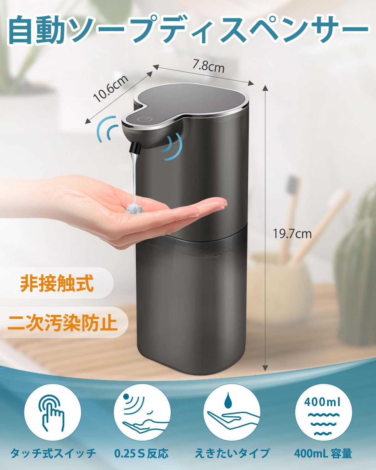 ソープディスペンサー ハンドソープ 非接触型アンチウイルス 自動 自動ディスペンサー 泡 USB充電式 半透明ボトル350ML大容量 耐水性 耐久性 使用便利 家庭/洗面所/キッチン/病院/学校などに適用