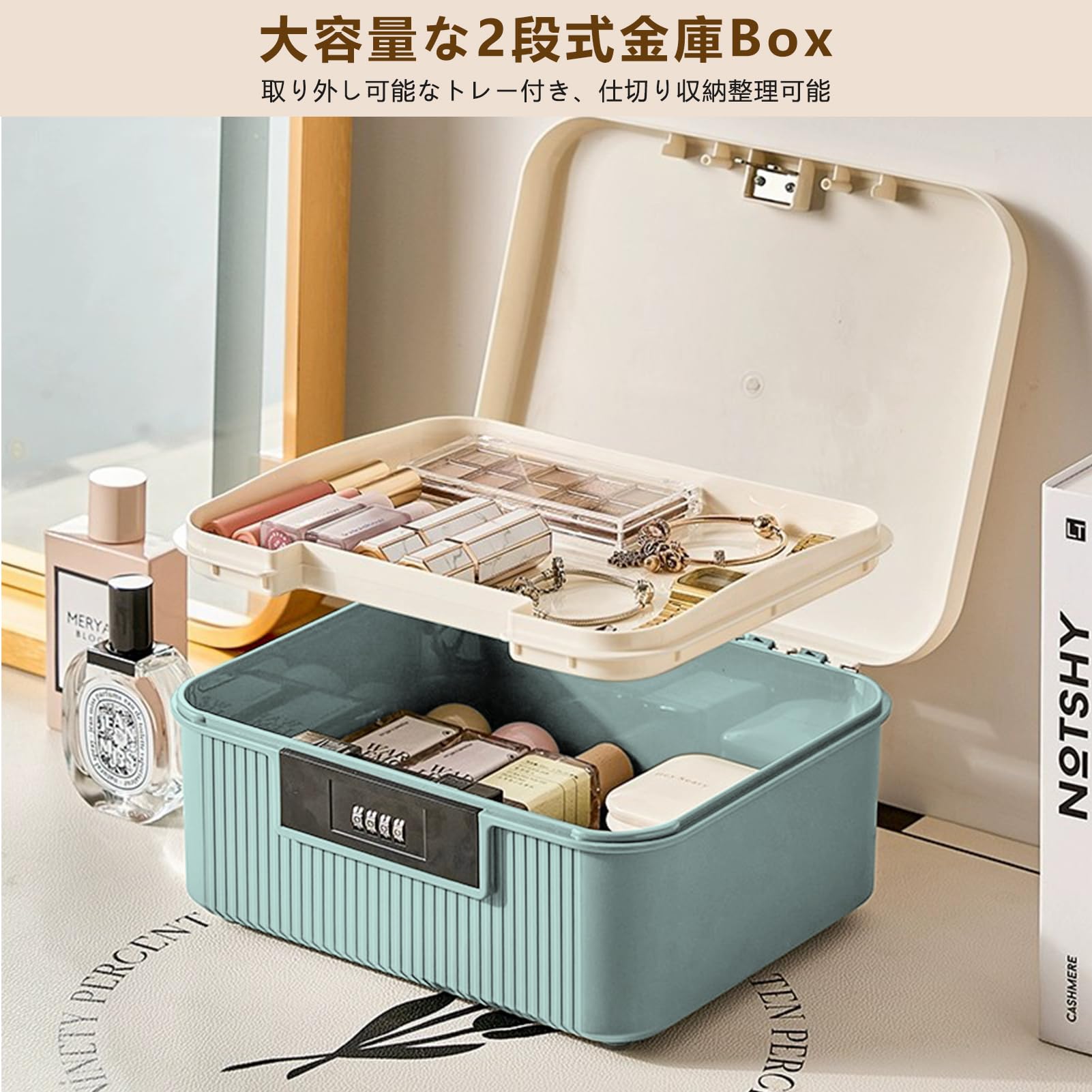 yazi 金庫 家庭用 小型 ダイヤル式 コンビネーションロック 収納ボックス 大容量2段式 9L ミニ金庫 プラスチック製 貯金箱 キャッシュ・重要書類・銀行カード 貴重品入れ (ブルー, M)