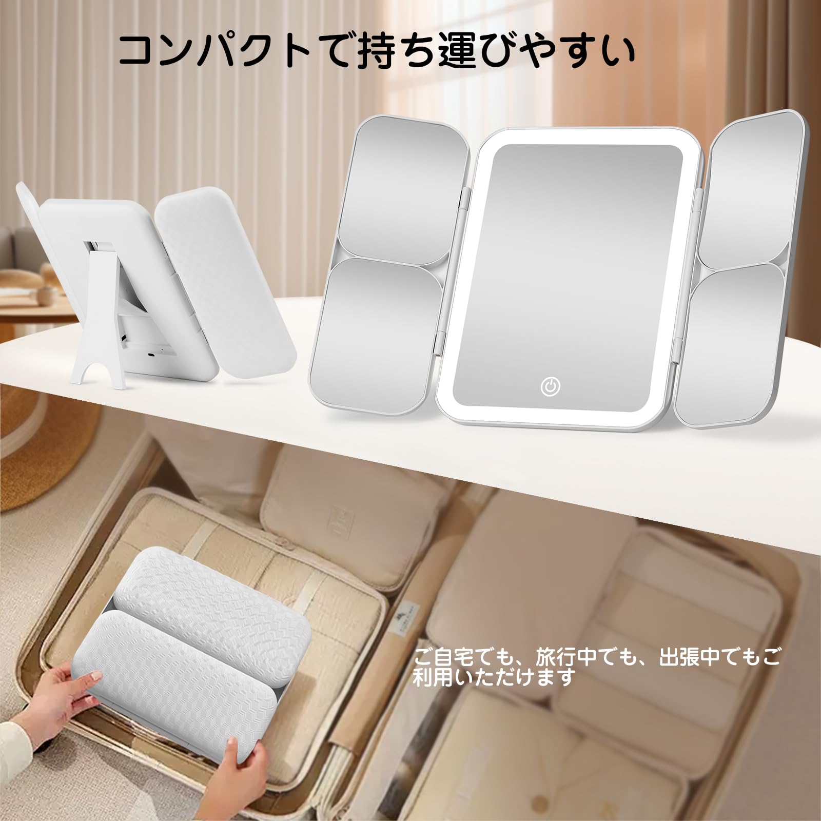 卓上鏡 女優ミラー 折りたたみ 化粧鏡 ライト付き 持ち運び便利 LED 3色モード 無段階の明るさ調整 メイクミラー(ホワイト)
