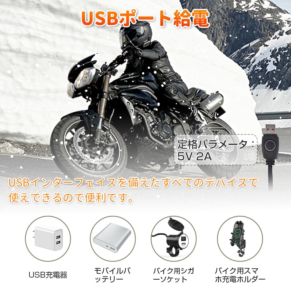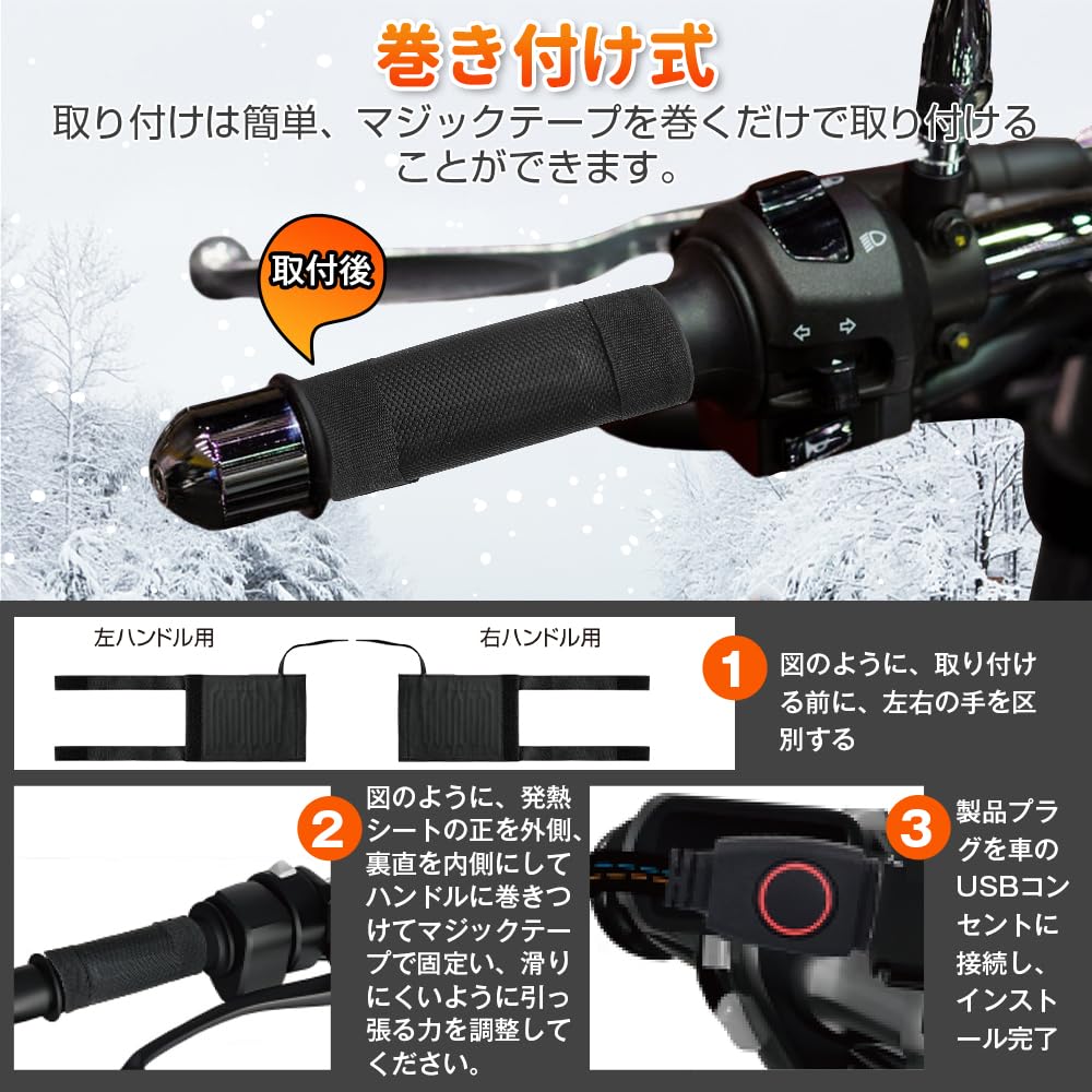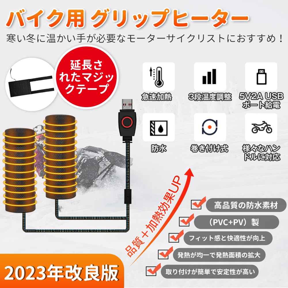 グリップヒーター バイク用 ハンドルヒーター 巻き付け式 5V2A USBポート スイッチ付き 3段階温度調整 防水 取り付け簡単 ホットグリップ オートバイ/自転車/原付/スクーター 防寒対策 冬 日本語取扱説明書