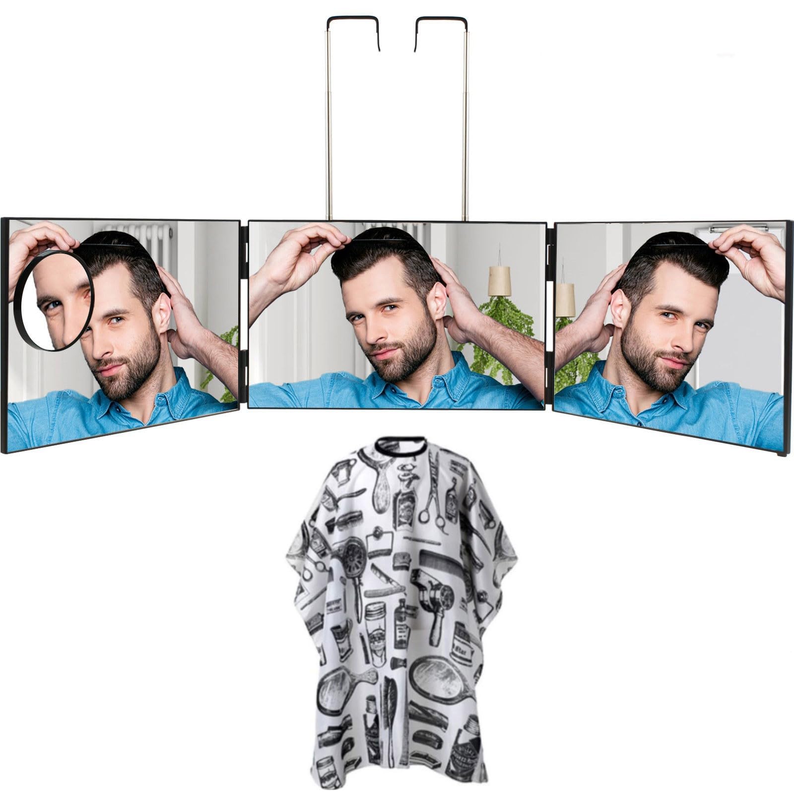 Feisate 三面鏡 セルフカット 散髪鏡 壁掛け 折りたたみ式 高さ調整可能 ヘアカット メイク鏡 理容ケープ+小さな鏡付属 髪型 後ろが見える コンパクト 収納 旅行用 (ブラック)