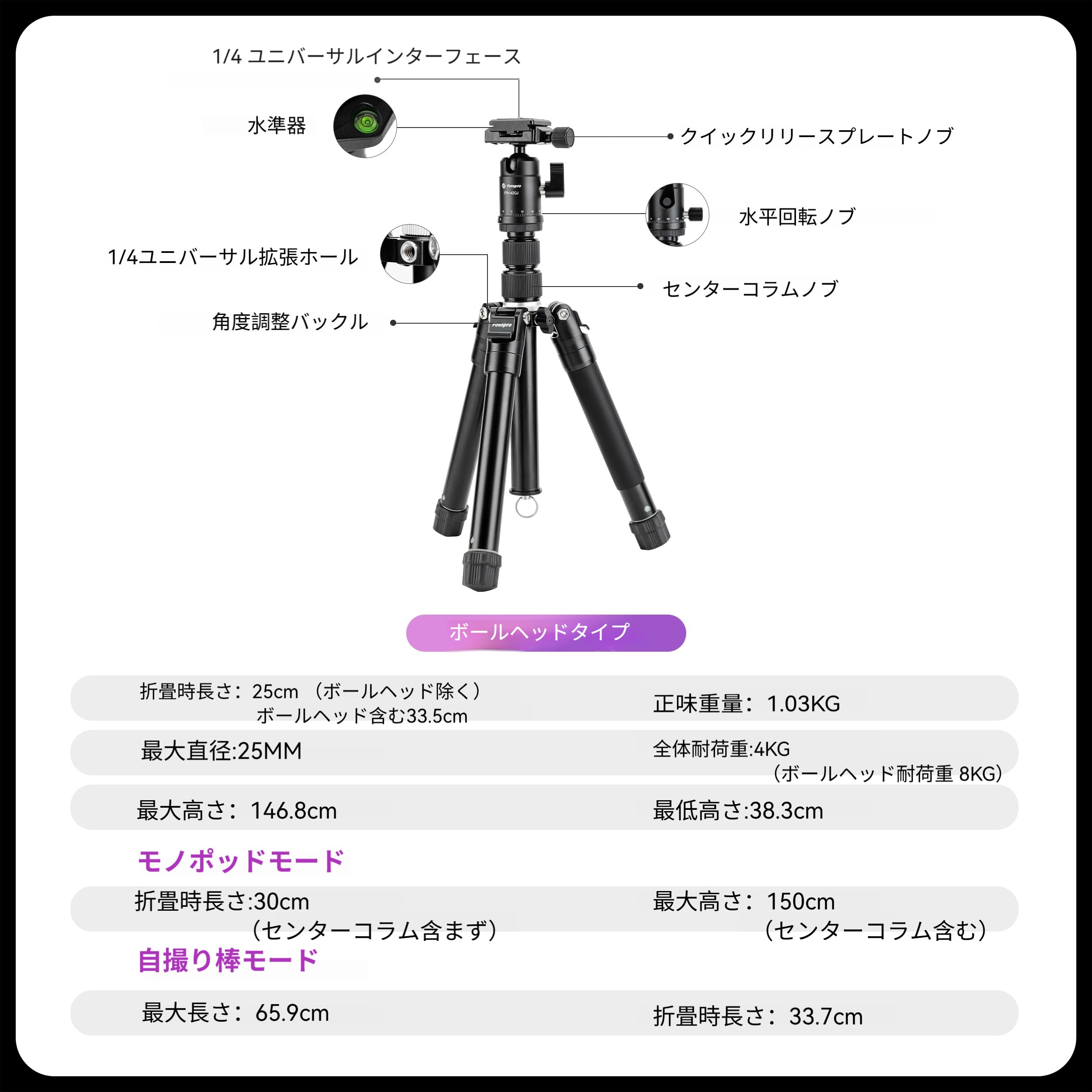 INNOREL 卓上三脚 ミニ 一脚スタンド 2段開脚 角度調整 スマホ デジカメ 折り畳み式 アルミ CNC 360度 ボールヘッド 球径30mm 耐荷重15KG 金属製 携帯電話 スマホ ホルダー付き 軽量 コンパクト カメラ 一眼レフ ビデオ 旅行 登山用(PW70)