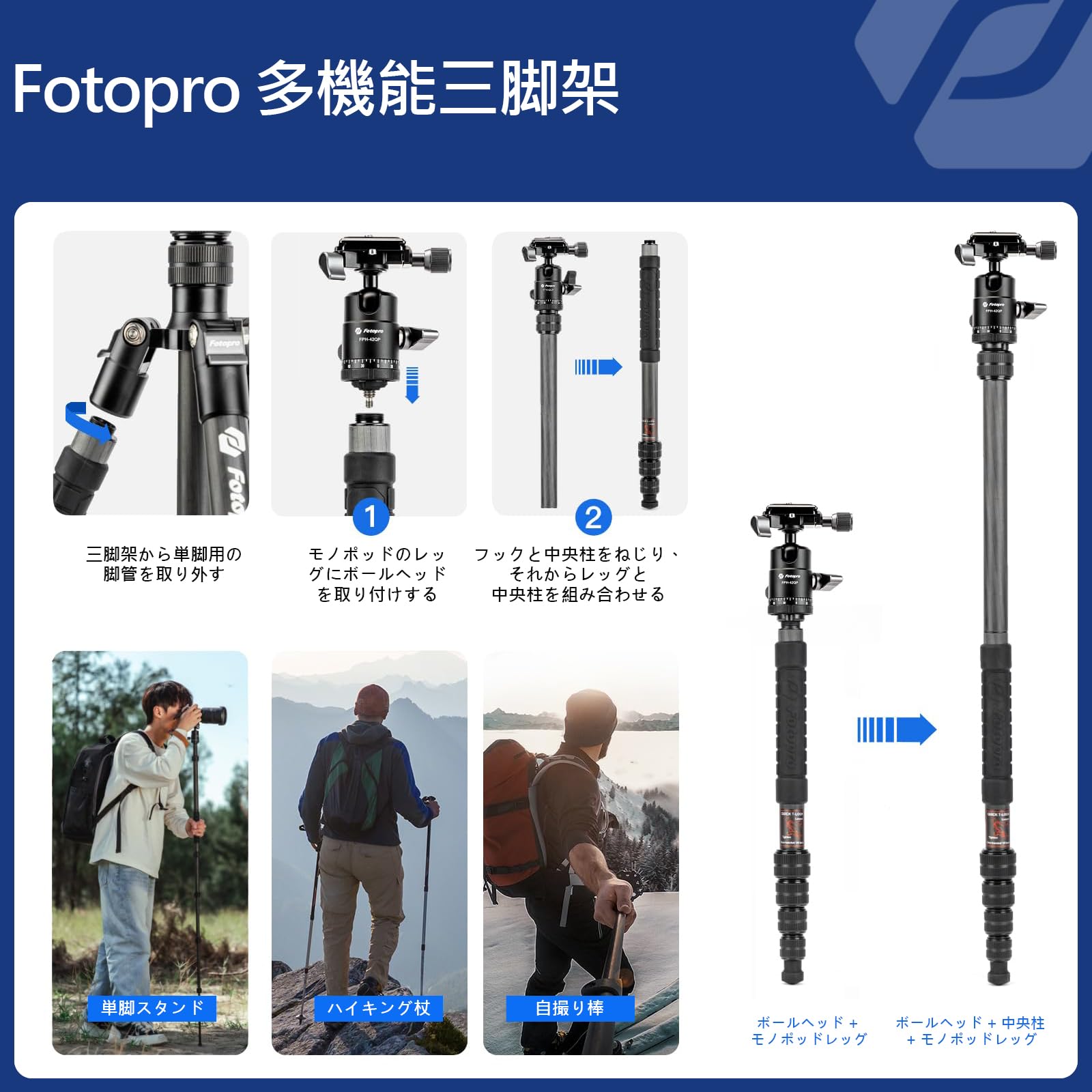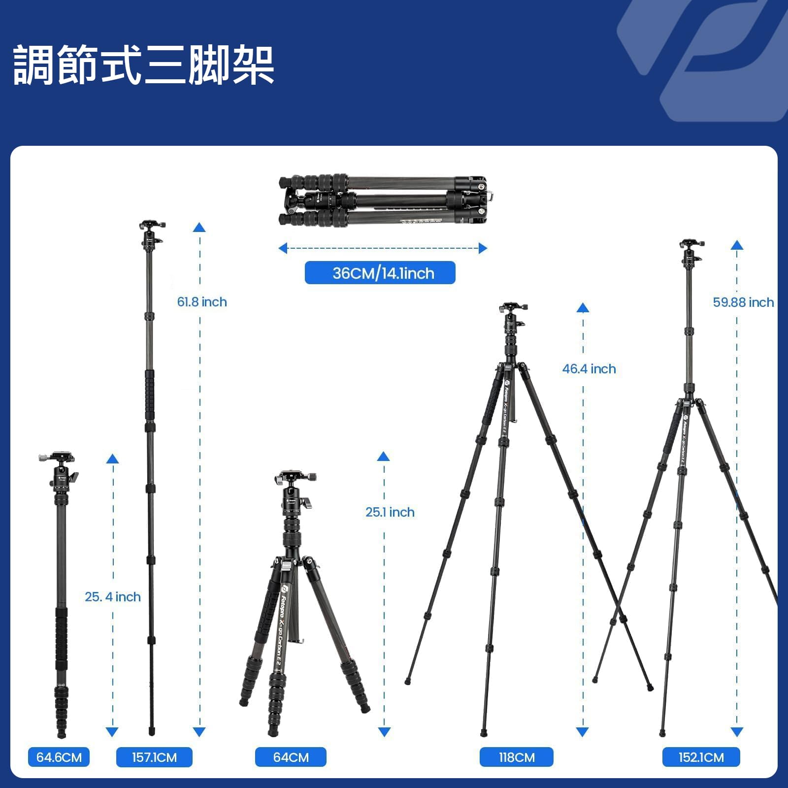 K&F Concept 三脚 カーボン 超軽量 コンパクト 5段 全高153cm 一脚可変式 自由雲台 ナットロック式 トラベル三脚 一眼レフ カメラ B210 「メーカー直営店」