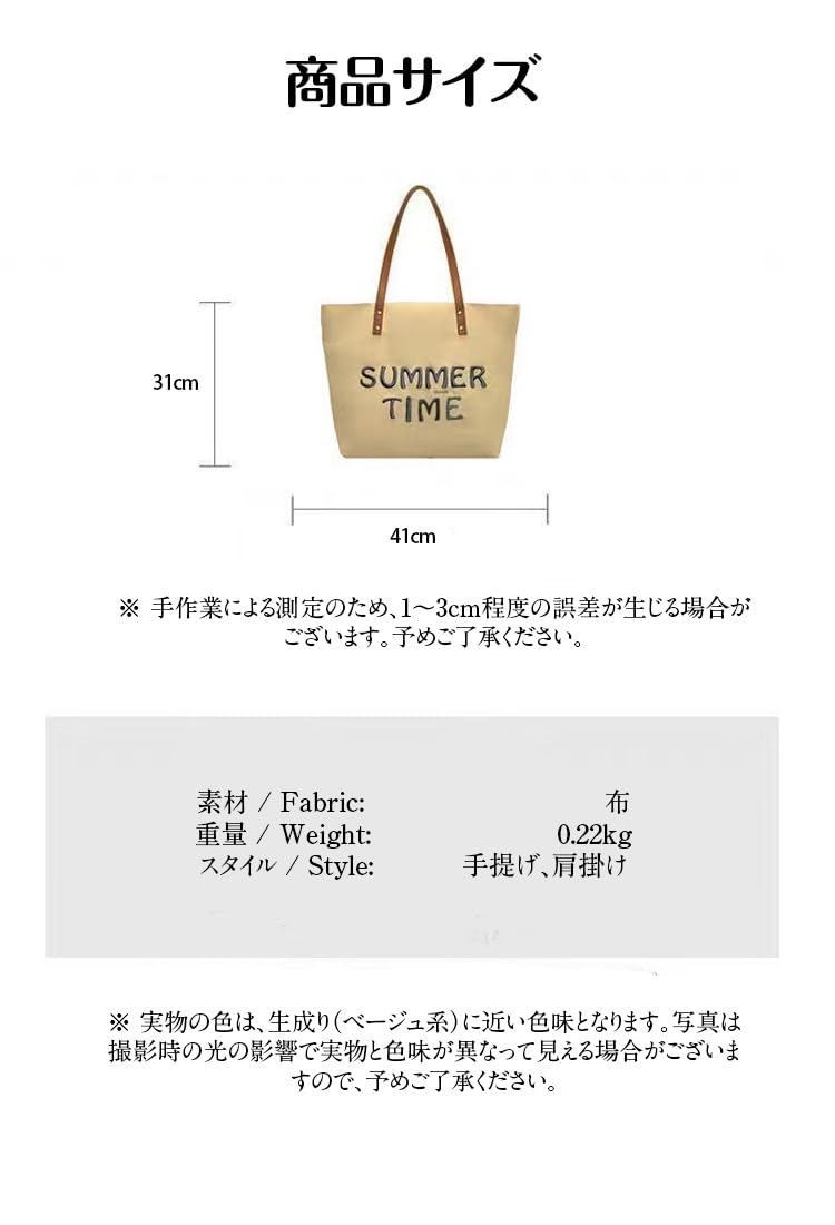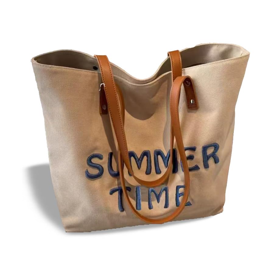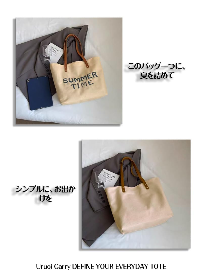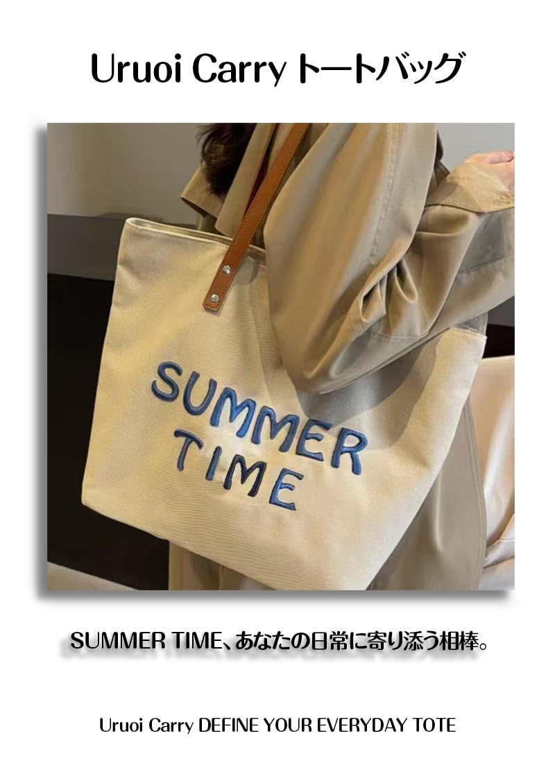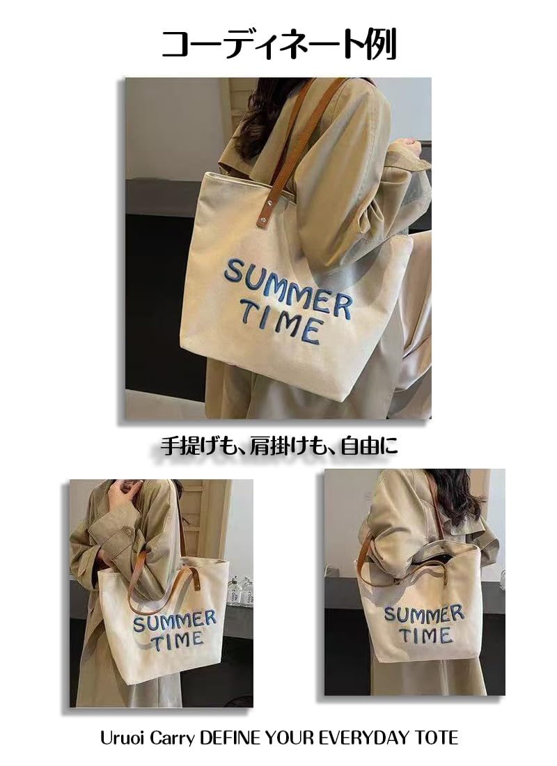 [Uruoi Carry] レディース キャンバストート A4対応 大容量 帆布 ショルダーバッグ 手提げバッグ エコバッグ おしゃれ マザーズバッグ カーキ “summer time” 刺繍 ファスナー付き