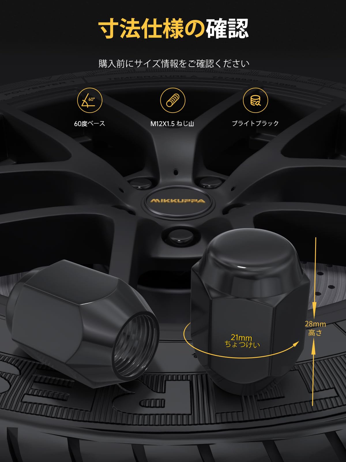 MIKKUPPA ホイールナット M12×P1.5 袋タイプ マツダ·ダイハツ·ミツビシに適用 テーパー座60° ラグナット ブラック 21HEX 長さ28 mm 20個セット SCM合金鋼 タイヤナット