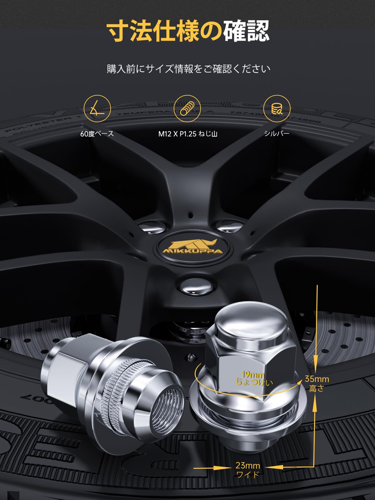 MIKKUPPA ホイールナット M12 x P1.25 テーパー座60° 長さ35 mm スチール製 19HEXニッサン・スズキの普通車と軽自動車に適用 20個 セット シルバー ラグナット