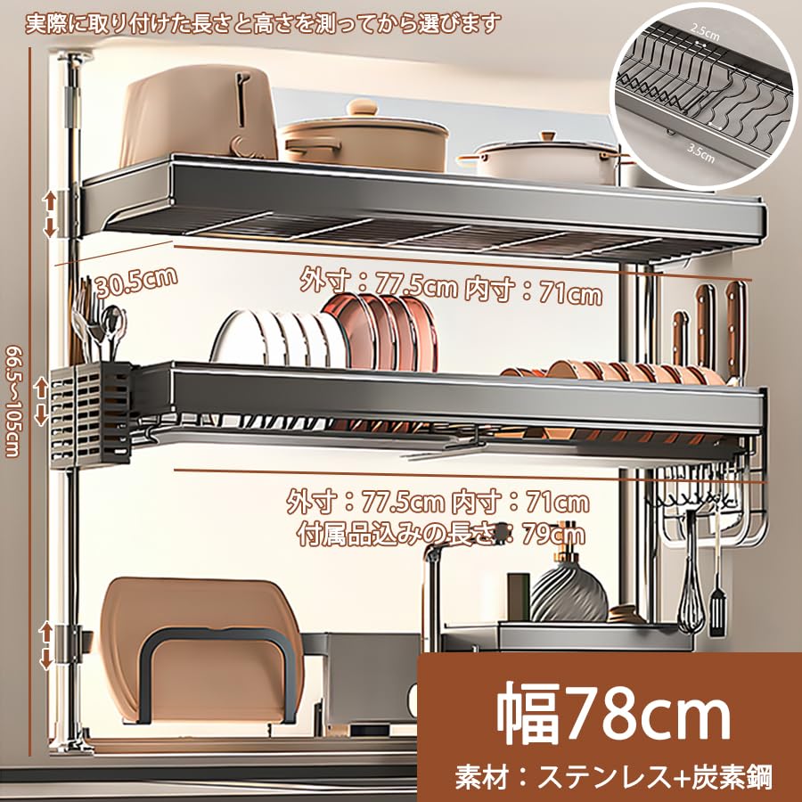 Zilnox 水切りラック シンク上 食器 水切り かご ラック 大容量 突っ張り つっぱり式 キッチン 省スペース 多機能収納 洗い物ラック 炭素鋼 グレー 2段 幅78x奥行30.5x高66.5-105CM