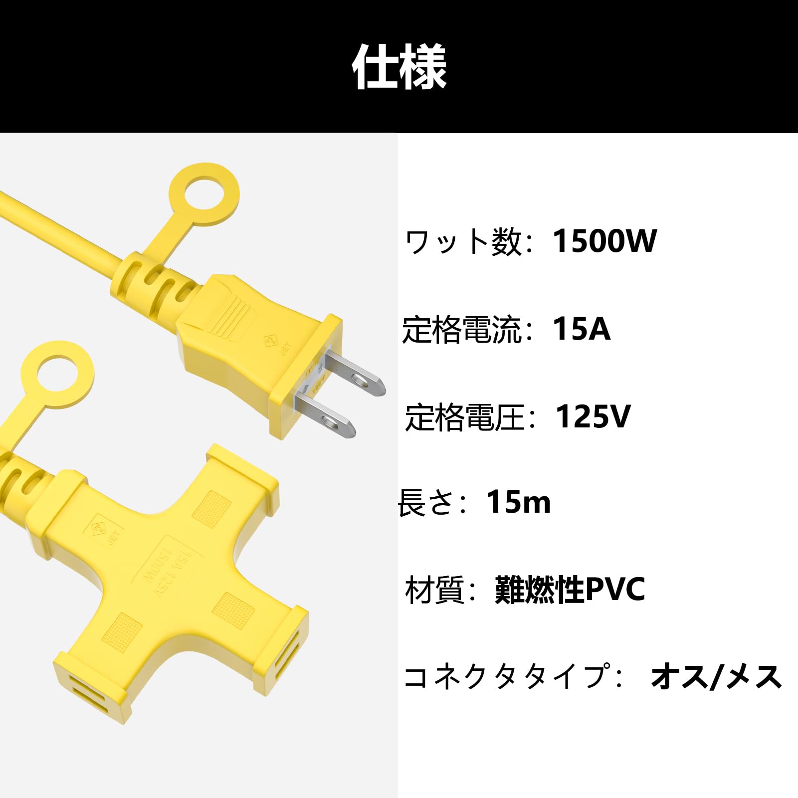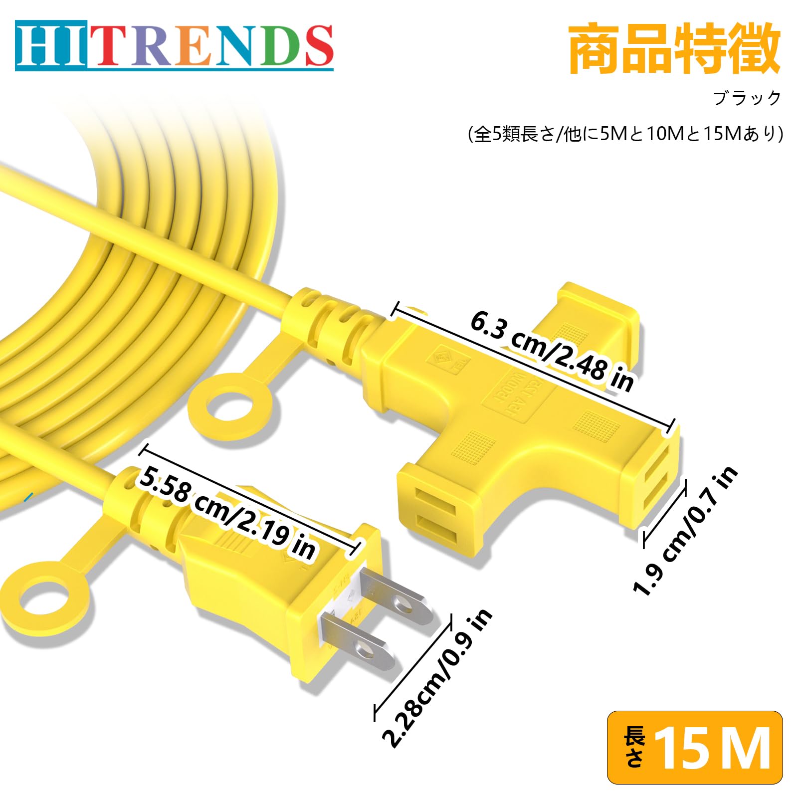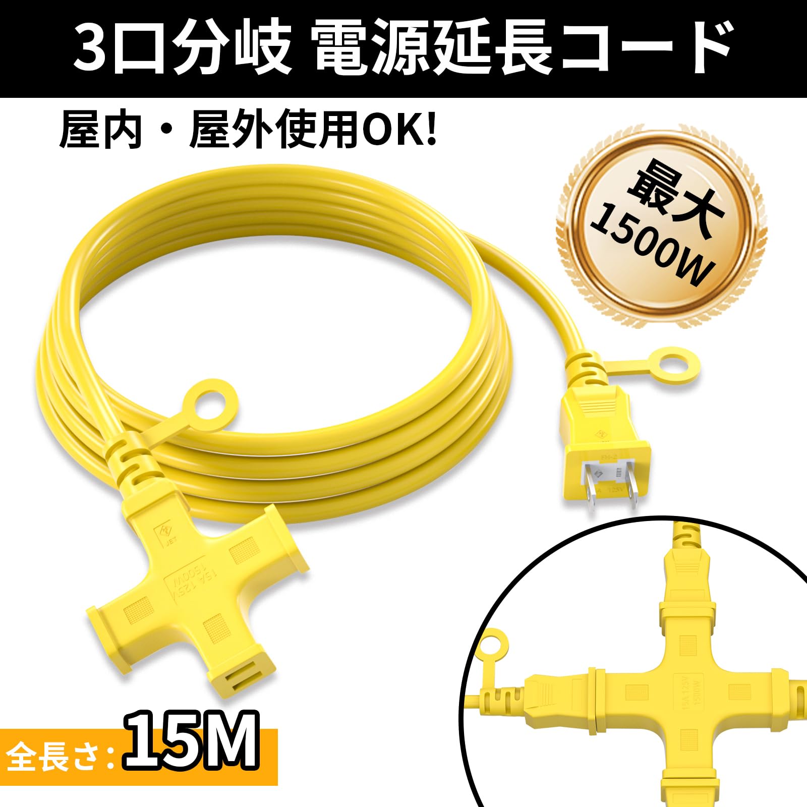 HITRENDS 延長コード 15m 延長コード 屋外 電源コード 電源タップ 15m 3個口 延長コード 15m 3分岐 延長コード 1500W 防雨型 ソフトケーブル 延長コード 十字型トリプル 延長ケーブル 延長コード 作業用 野外用延長コード コードリール イエロー (15m)