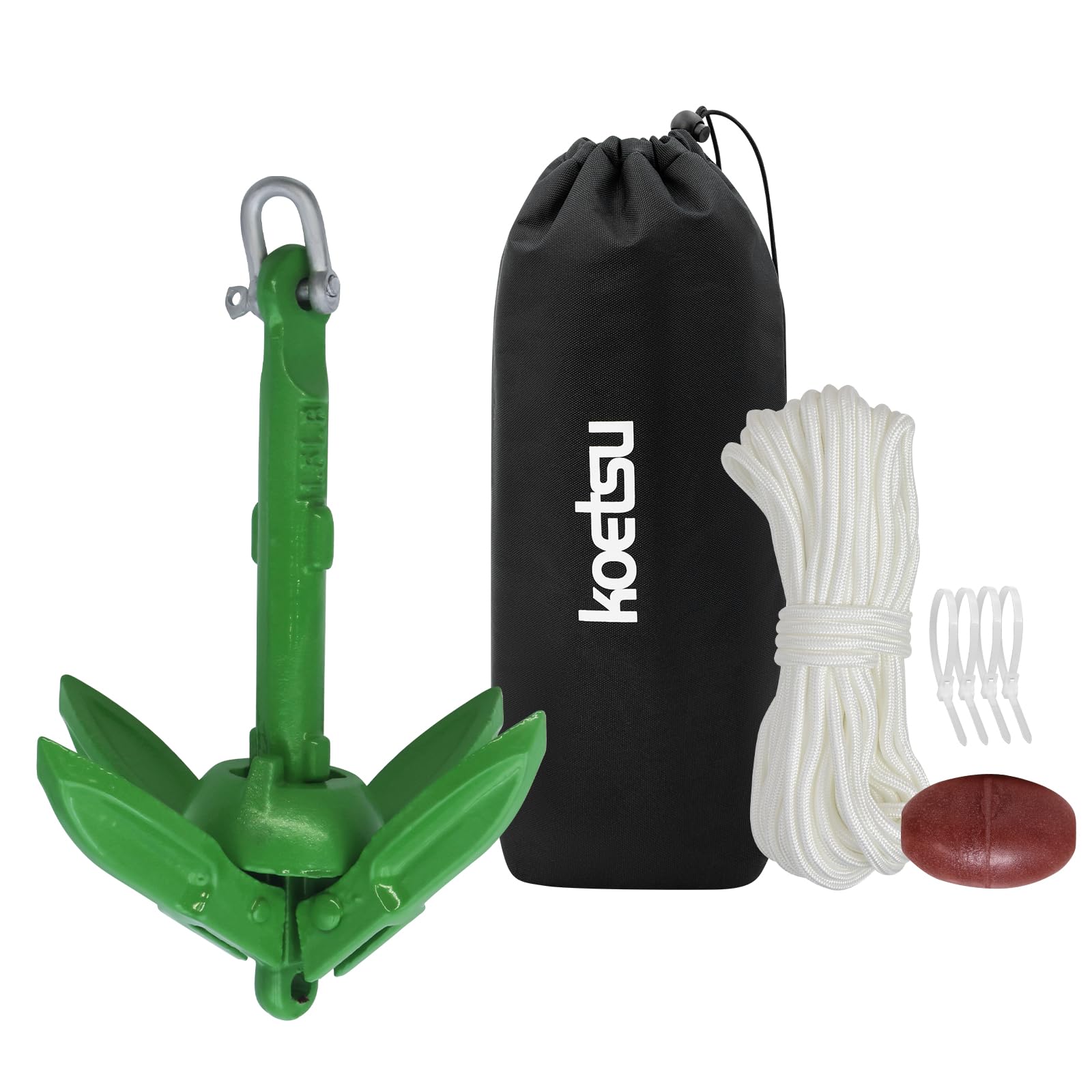 KOETSU アンカーキット、0.7 kg、折りたたみ式、完全に引っ掛かり防止、6mm 20m アンカーロープ、収納バッグ、ラッシングストラップ、アンカーボール付き、小型ボート、カヤック、SUP、インフレータブルボート、ジェットスキー、湖釣り、浅瀬釣り、アンカー釣りに最適 緑