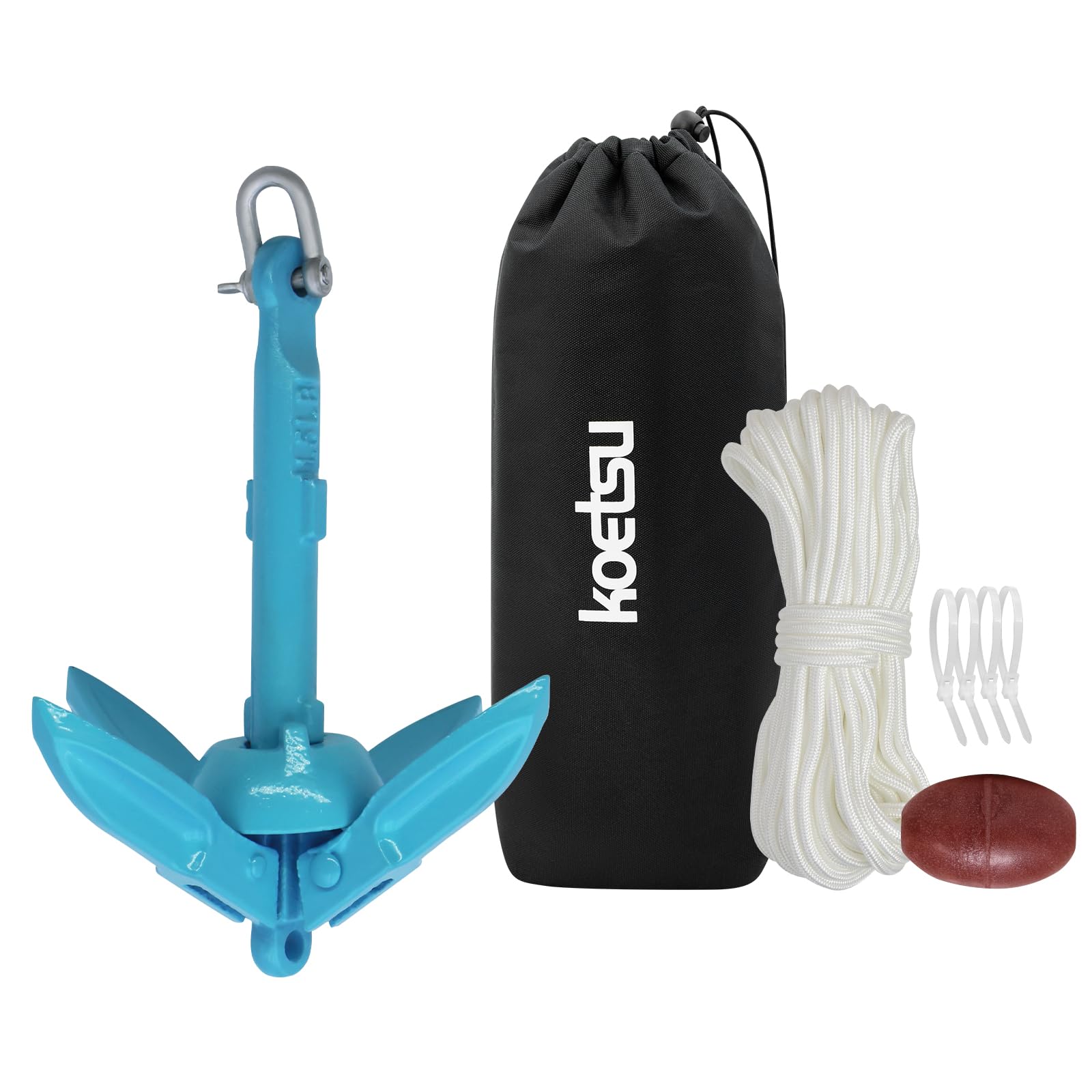 KOETSU アンカーキット、0.7 kg、折りたたみ式、完全に引っ掛かり防止、6mm 20m アンカーロープ、収納バッグ、ラッシングストラップ、アンカーボール付き、小型ボート、カヤック、SUP、インフレータブルボート、ジェットスキー、湖釣り、浅瀬釣り、アンカー釣りに最適 青