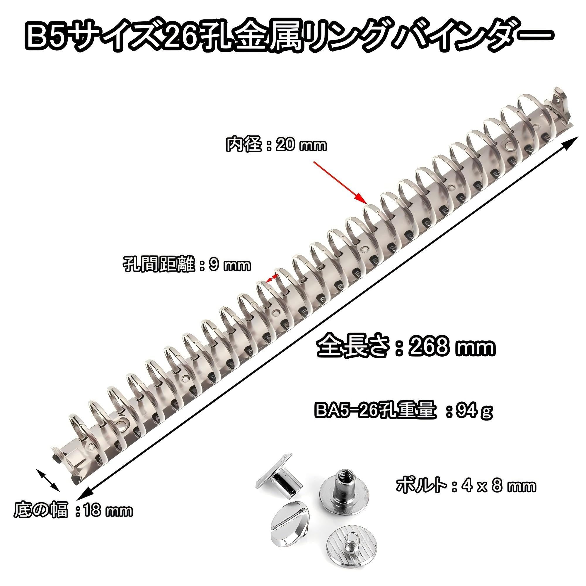 B5 多穴式リング バインダー金具 背なしタイプ 26穴【B5-26-20/18】18mm×268mm リング内径20mm 鉄ニッケル鍍金 シルバーシカゴスクリュ付き 手帳 製本