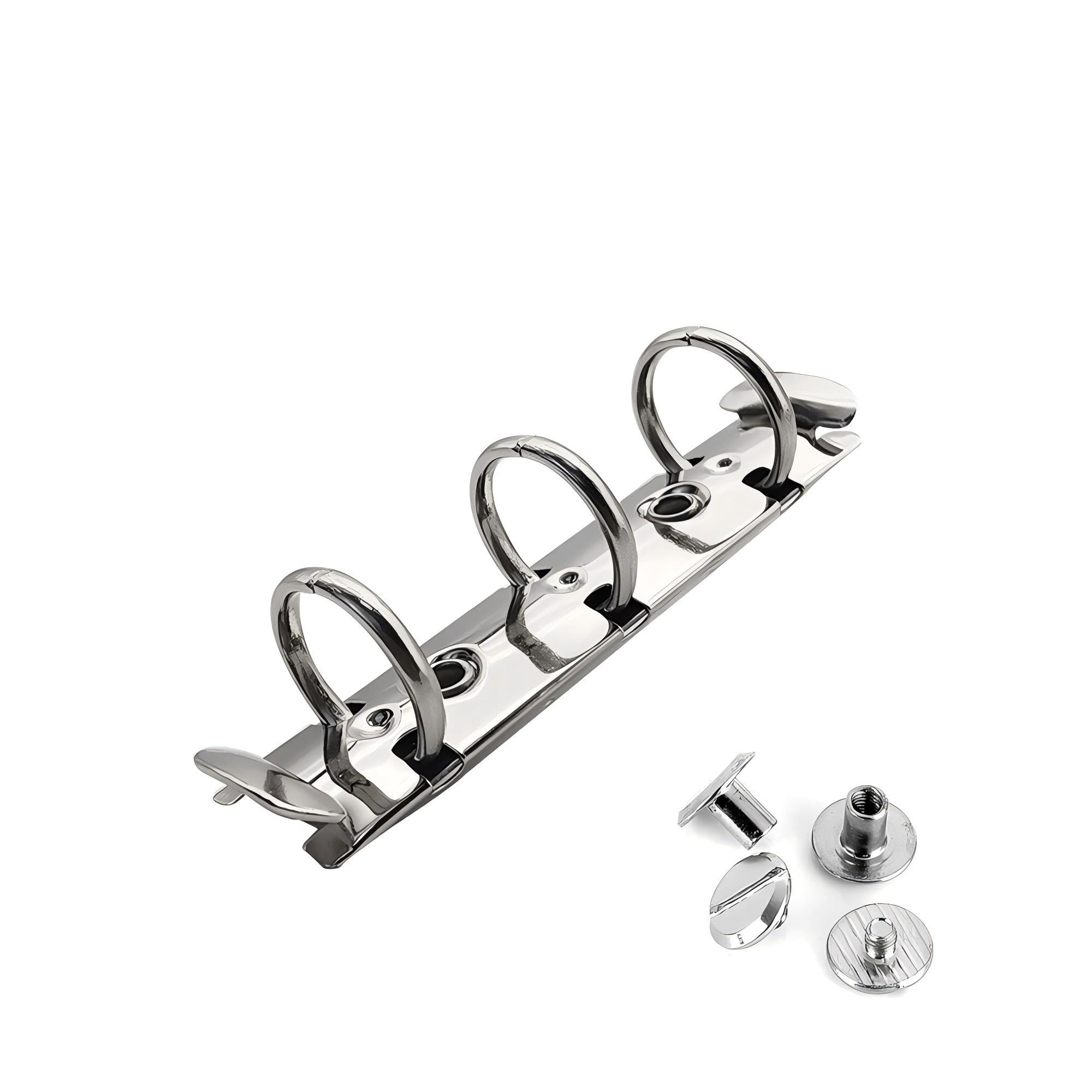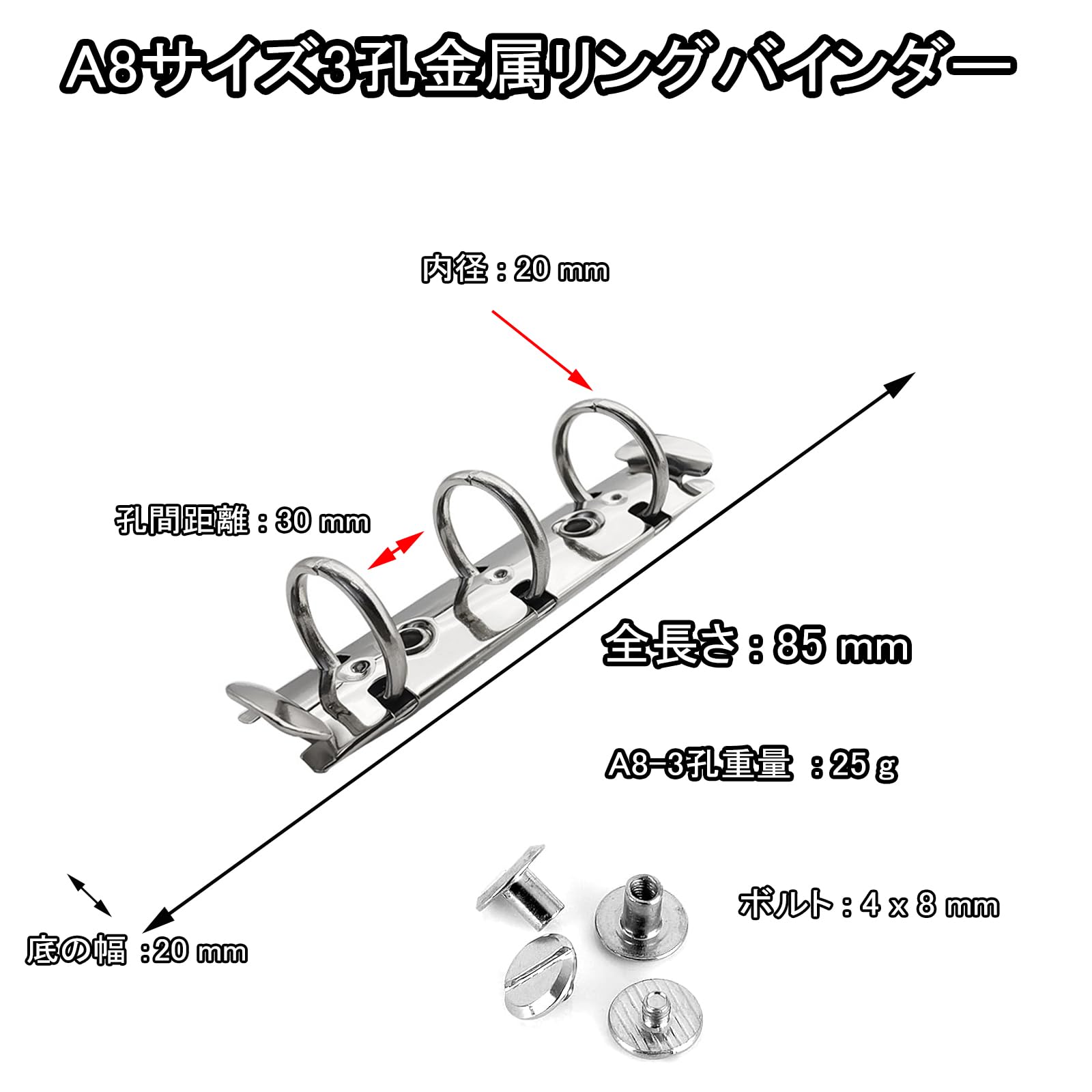 ルーズリーフリング A8 多穴式 バインダー リング 金具 背なしタイプ 3穴 ルーズリーフ リング 20mm x 85mm リング内径20mm 鉄ニッケル鍍金 シルバーシカゴスクリュ付き 手帳 製本 (A8-3穴)