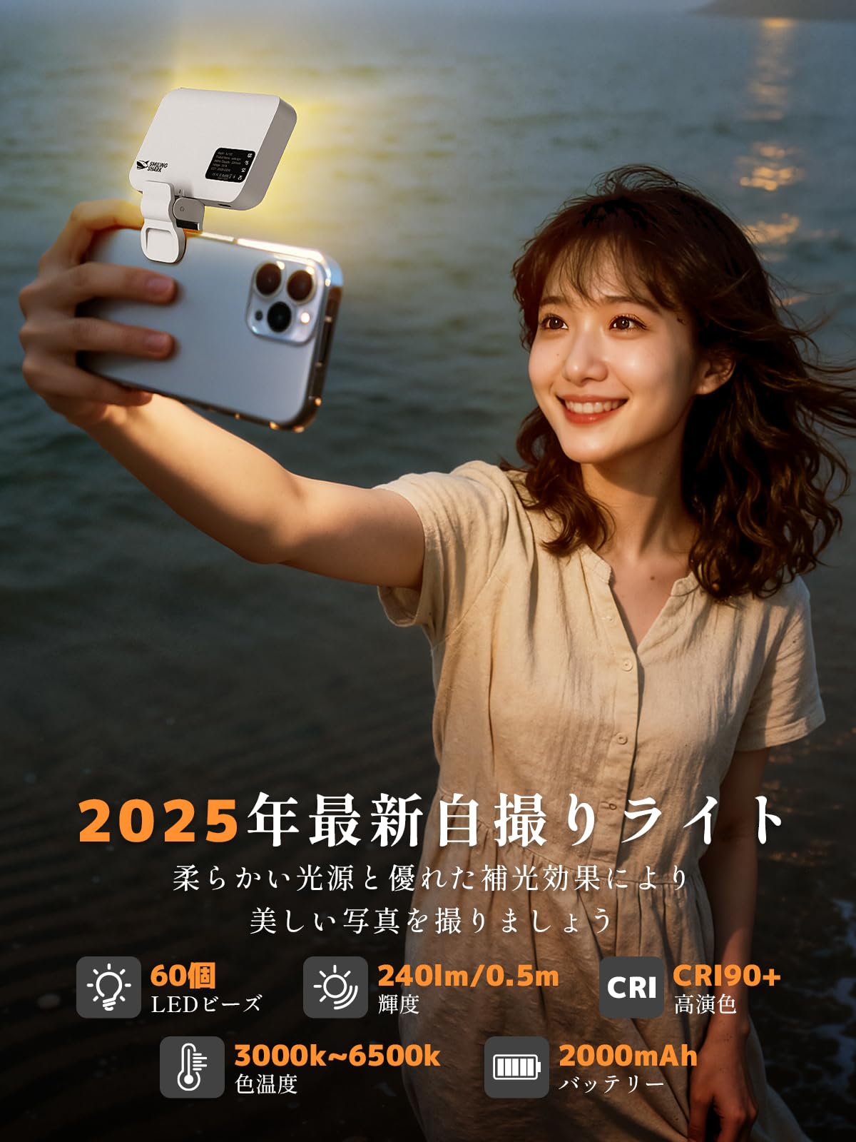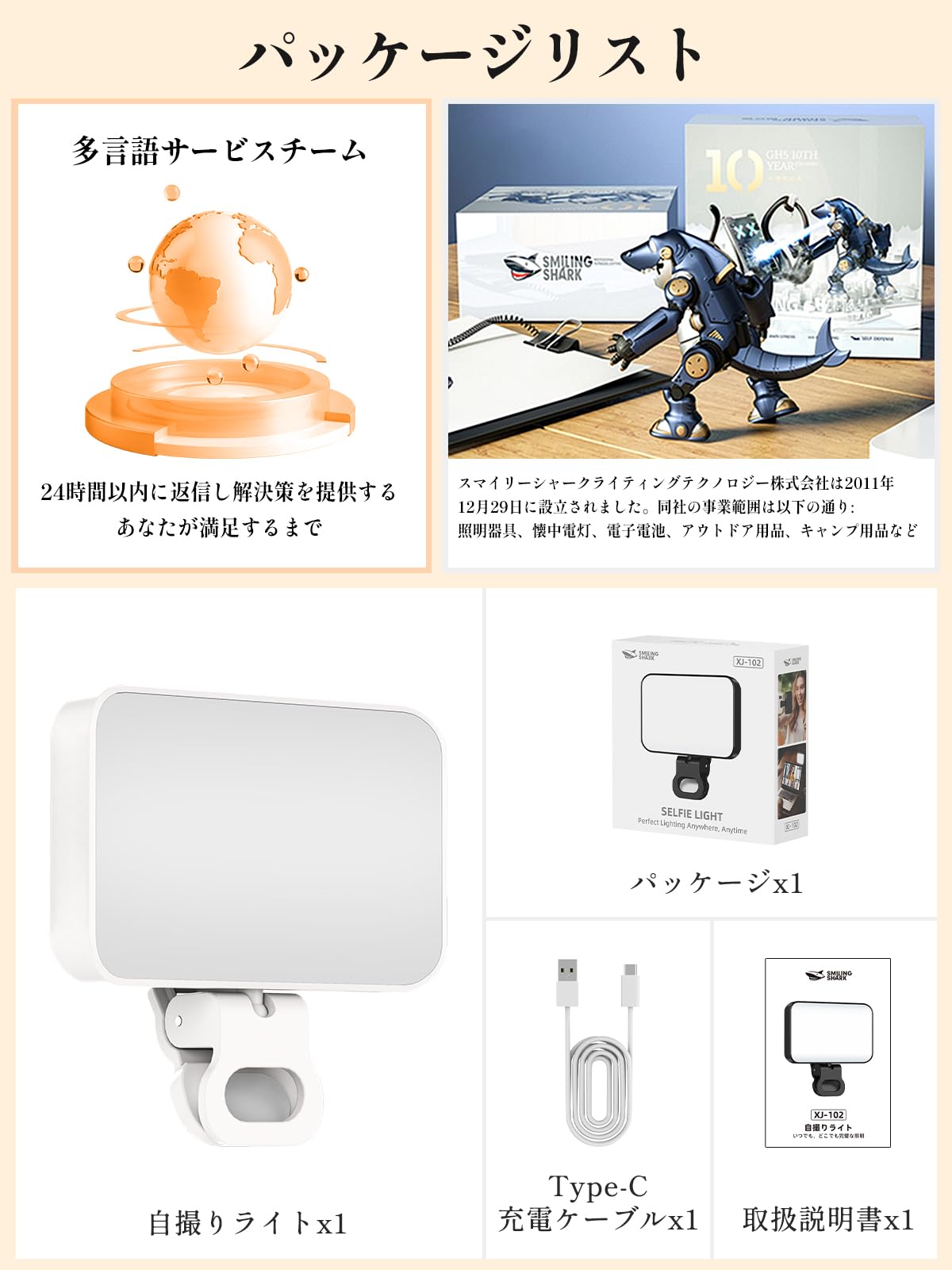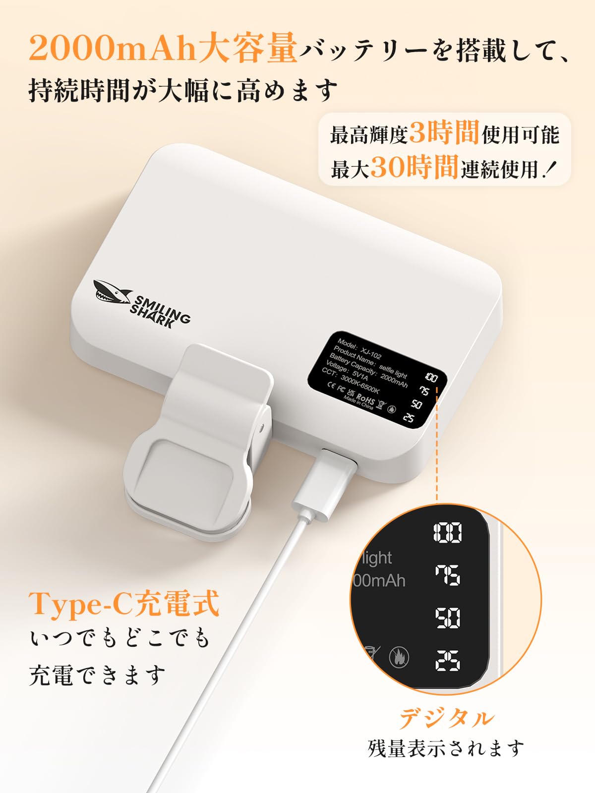 Smiling Shark自撮りライト 【クリップ&直立両用・60個LED灯珠·8時間使用可能】 スマホライト 女優ライト 高演色CRI90+ 美顔照明 3色10段調光 クリップ式 直立可能 左右360° 上下90°調整 2000mAh 充電式 残量表示 105g小型軽量 自撮り・動画撮影・オンライン会議に最適 Zoom/YouTube/TikTok補光ライト 撮影用ライト 日本語取扱説明書 黒