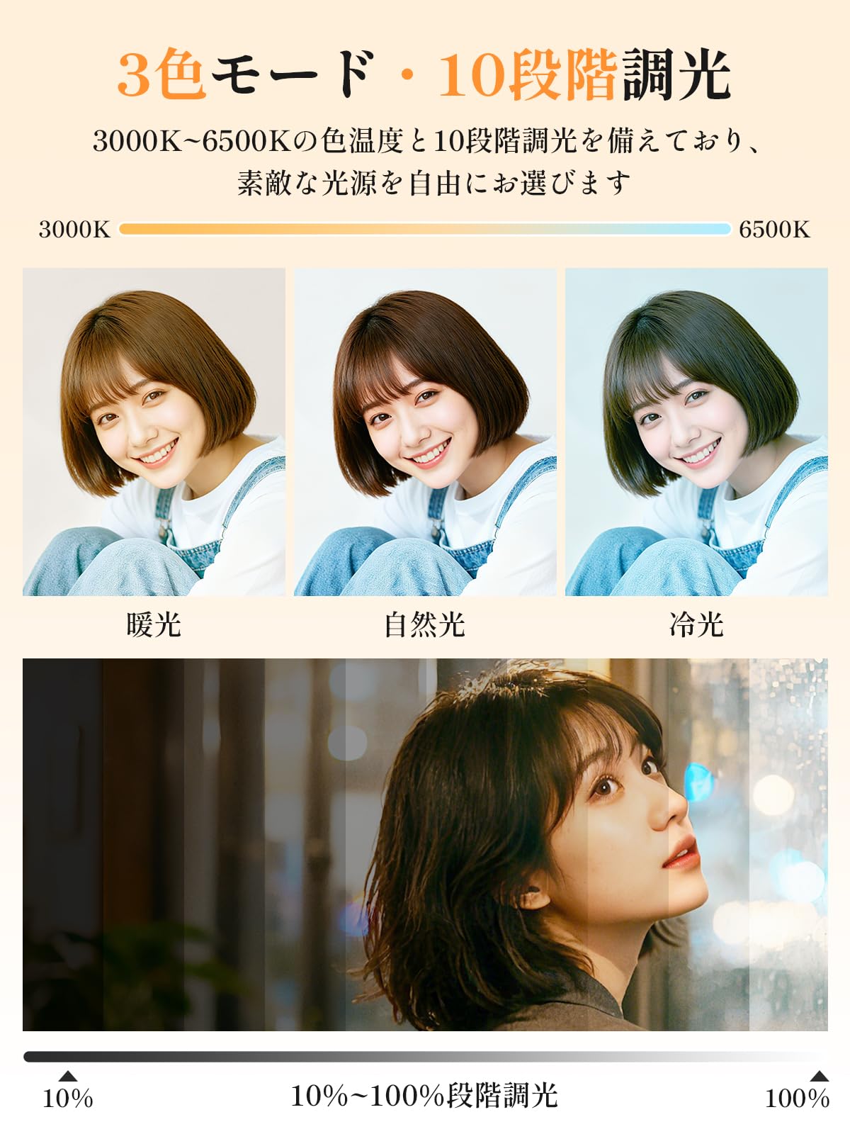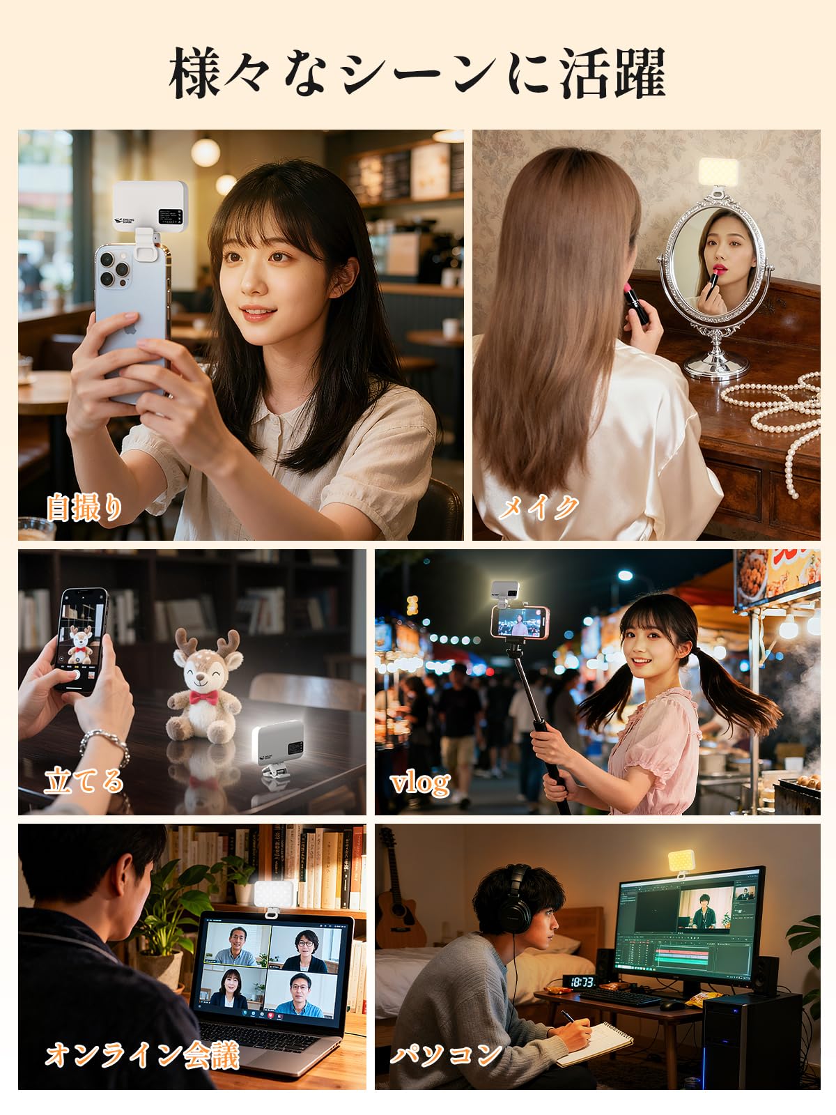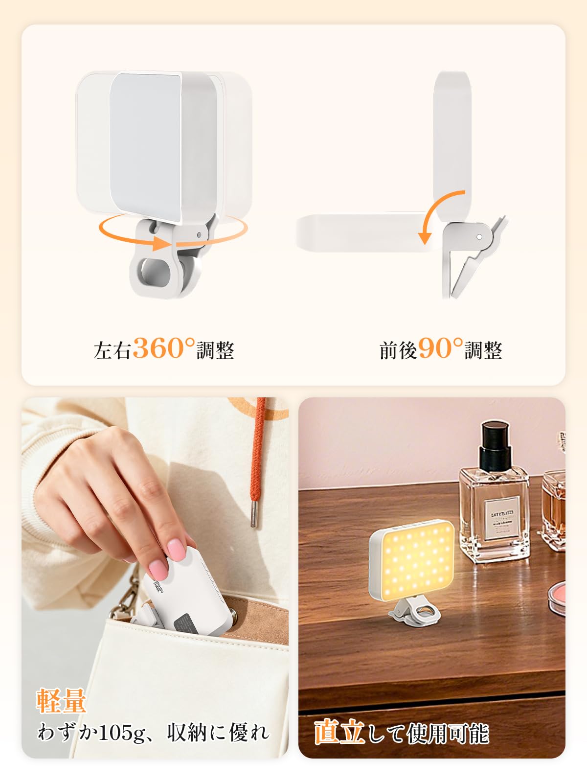 UBeesize自撮りライト スマホライト 小型 USB充電 三色 7レベル明るさ 3000K~6500K調光 軽量 クリップ式 コンパクト 持ち運び 女優ライト じどりライト XJ51 適格請求書発行可
