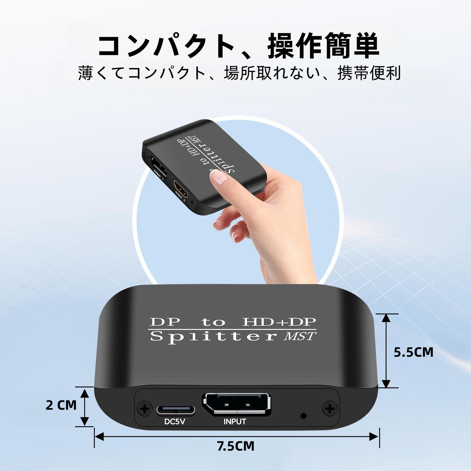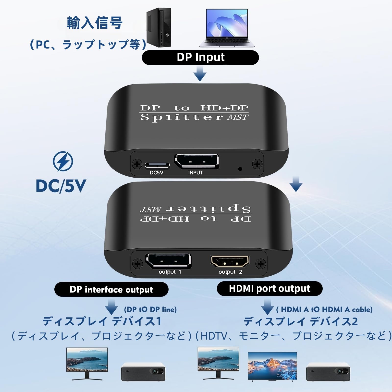 DisplayPort to HDMI + Displayport 分配器 4K@60Hz MST SST 拡張/ミラーモード DP to DP + 4K HDMI出力 1入力2出力DisplayPort 1.3 3D/HDR対応 デスクトップ、ノートパソコン、PC、モニター、プロジェクターなどに対応