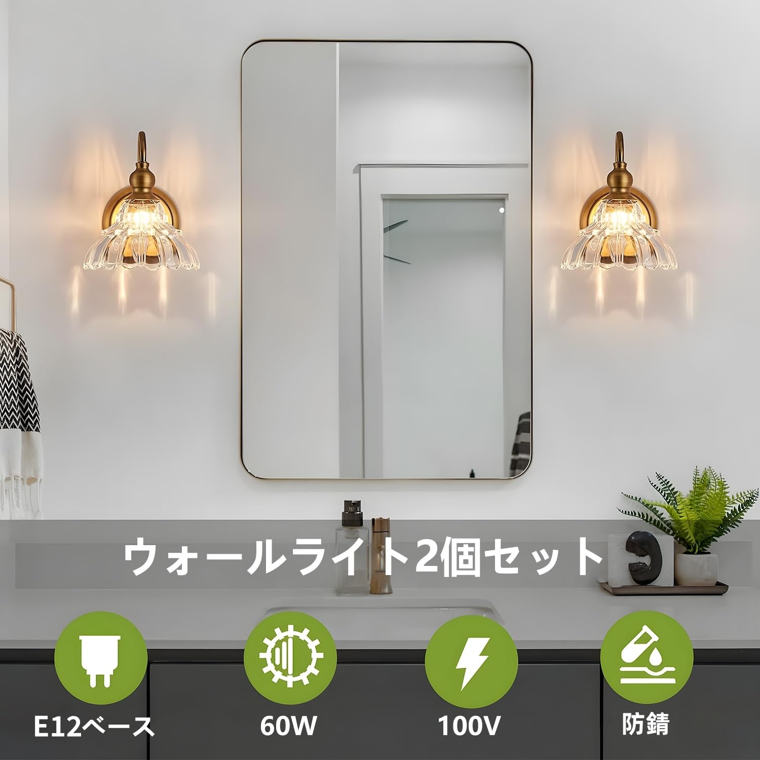 KCO Lighting 北欧ヴィンテージ ウォールライト/ブラケットライト クリスタルガラス製 2灯セット 2WAY 取り付け 三色調光 E12 錆び防止 階段・浴室ミラー・寝室向け 電球別売り