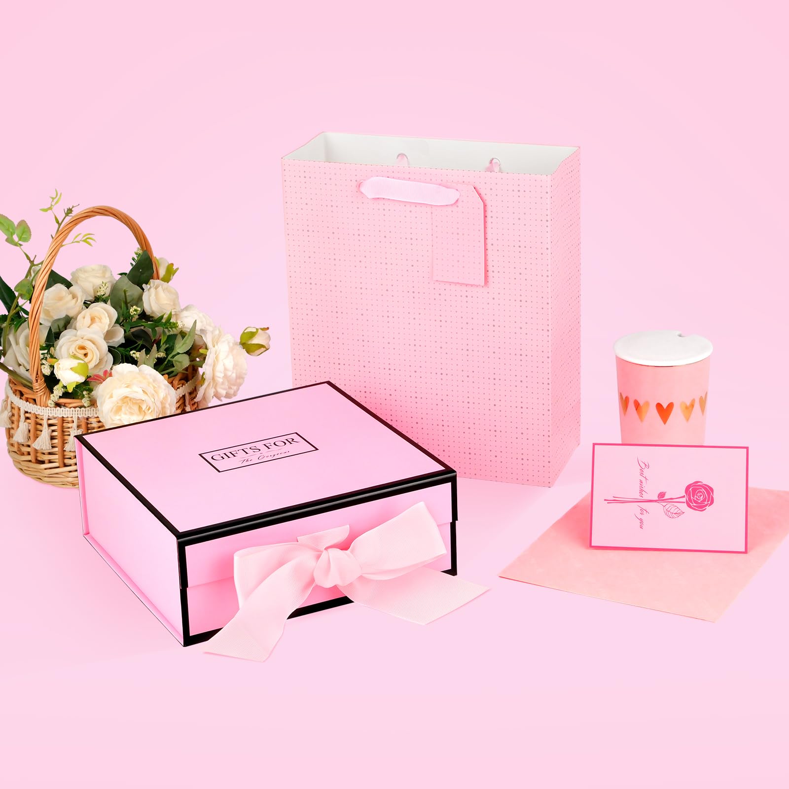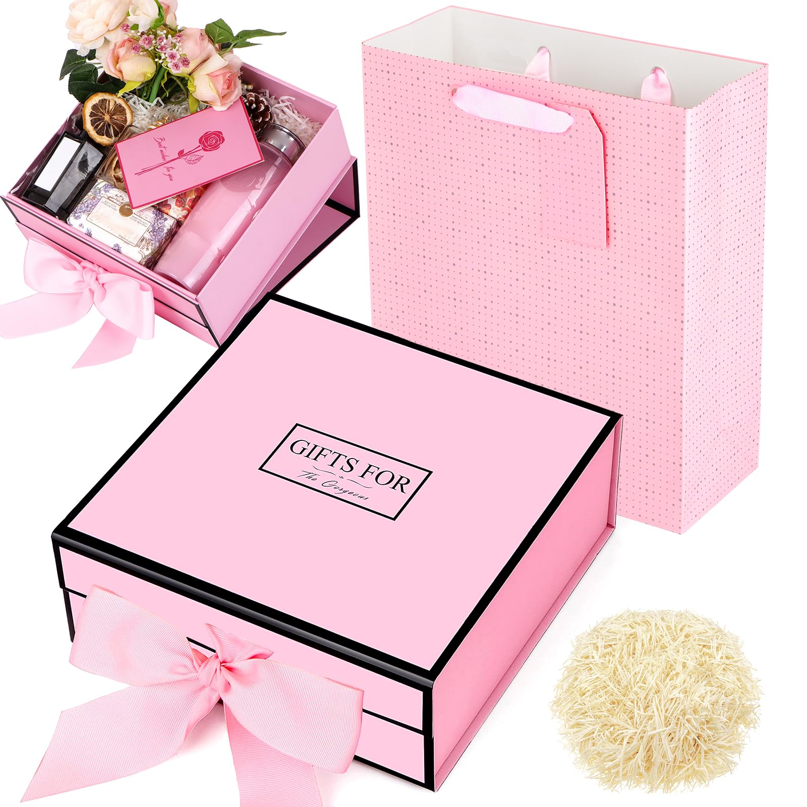 JiaWei ギフトボックス 蓋付き 磁気,ギフトバッグリボン パッケージボックスセット,付き手提げ用,細断紙グリーティング 24 x 24 x 9.5cm, 高級プレゼントぼっくす 箱, 蝶結び 贈り物, プレゼントボックス, 結婚式, 花嫁介添人, パーティー (ピンク)