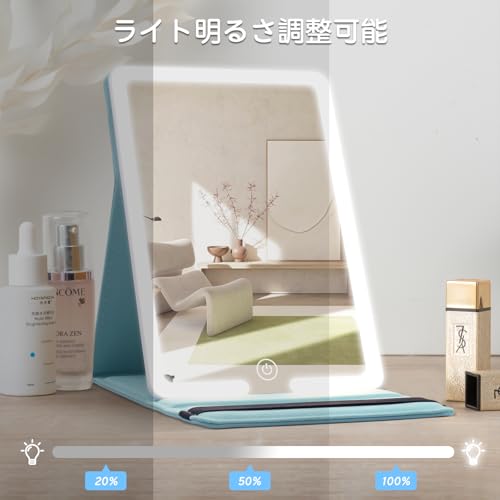 化粧鏡 卓上鏡 LEDライト付き 3光色 明るさ無段階調光 USB充電式 スタンドミラー コンパクトに折りたたんで持ち運び 折り畳み式 明るさ無段階調光 USB充電式 消し忘れ防止機能 収納便利 旅行用 持ち運びに便利 (ブルー)