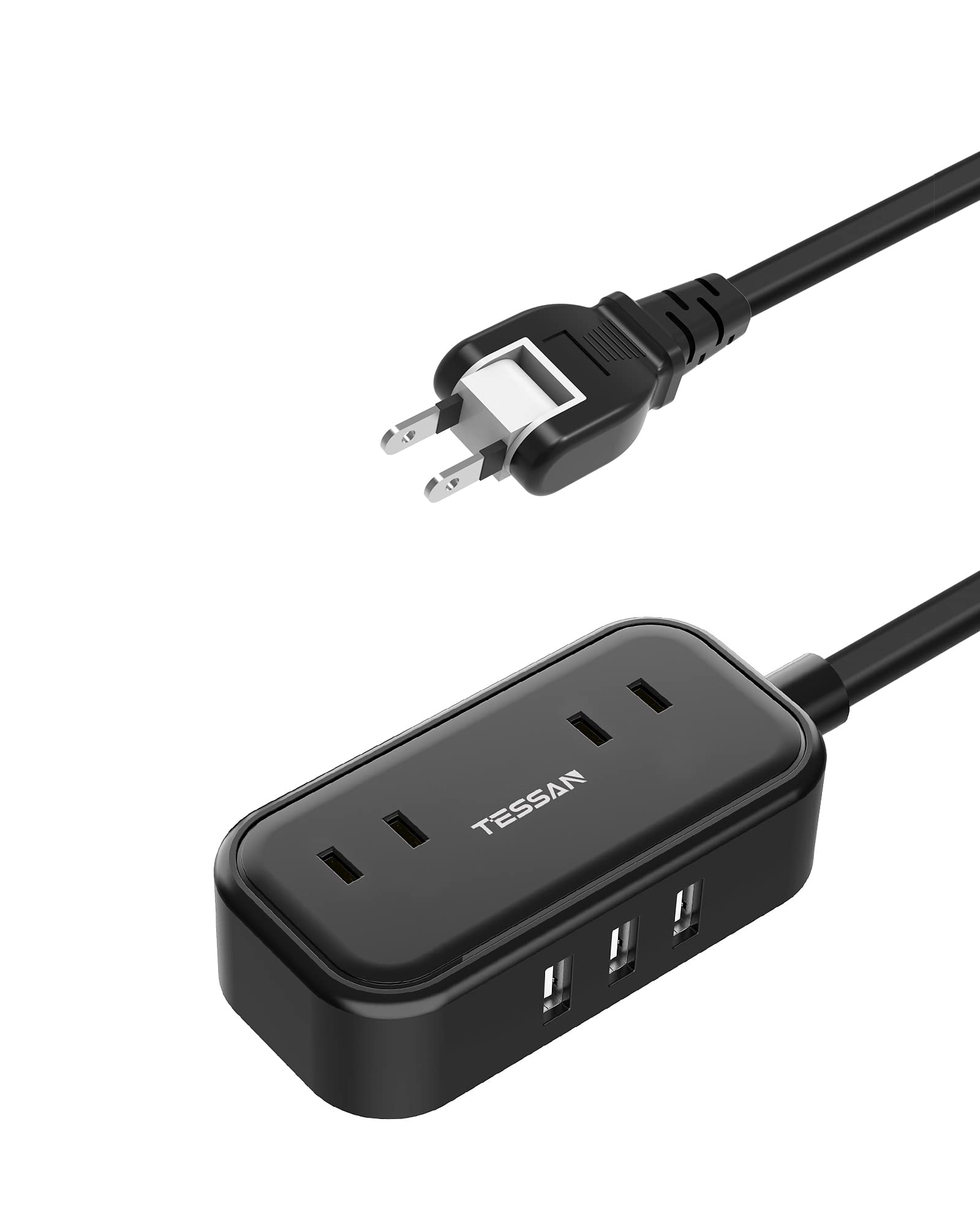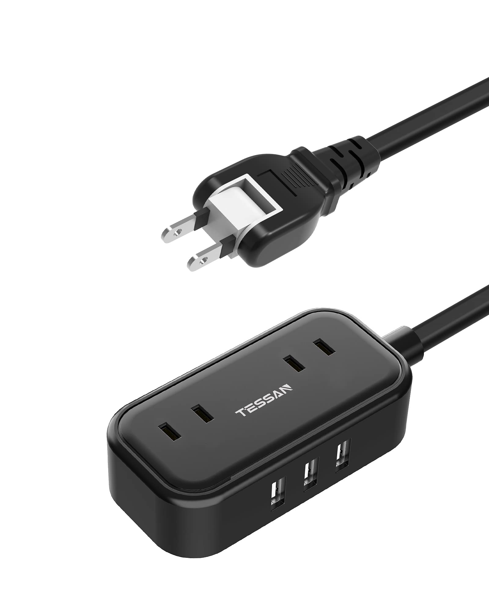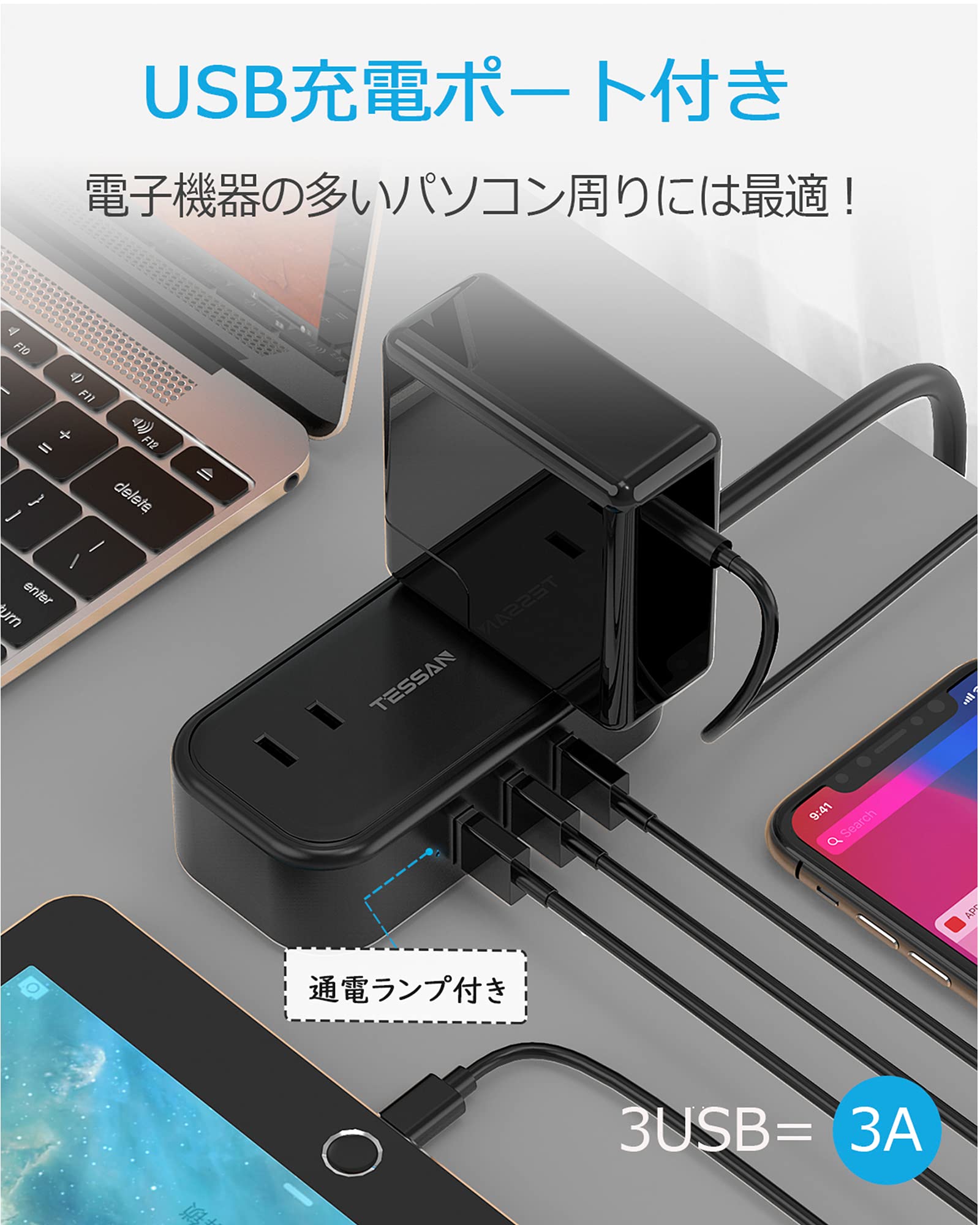 延長コード 2m 黒 電源タップ ブラック コンセントタップ たこあしコンセント テーブルタップ TESSAN 延長コード usb付き 3個AC口 三つのUSB-Aポート タコ足配線 スイングプラグ oaタップ マルチタップ 壁掛け式/卓上に 小型軽量 出張/旅行