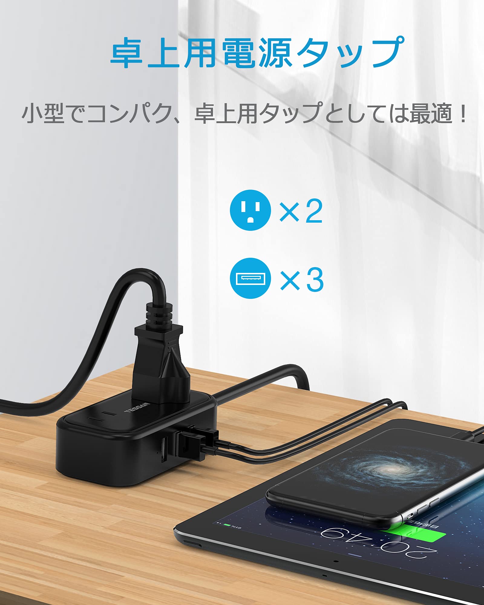 usb コンセント 電源タップ usb付き 2個AC口 3USBポート 延長コード 1.5m 小型 タップusb 充電タップ 蛸足コンセント タコ足配線 テーブルタップ マルチタップ oaタップ コンパクト(ブラック)