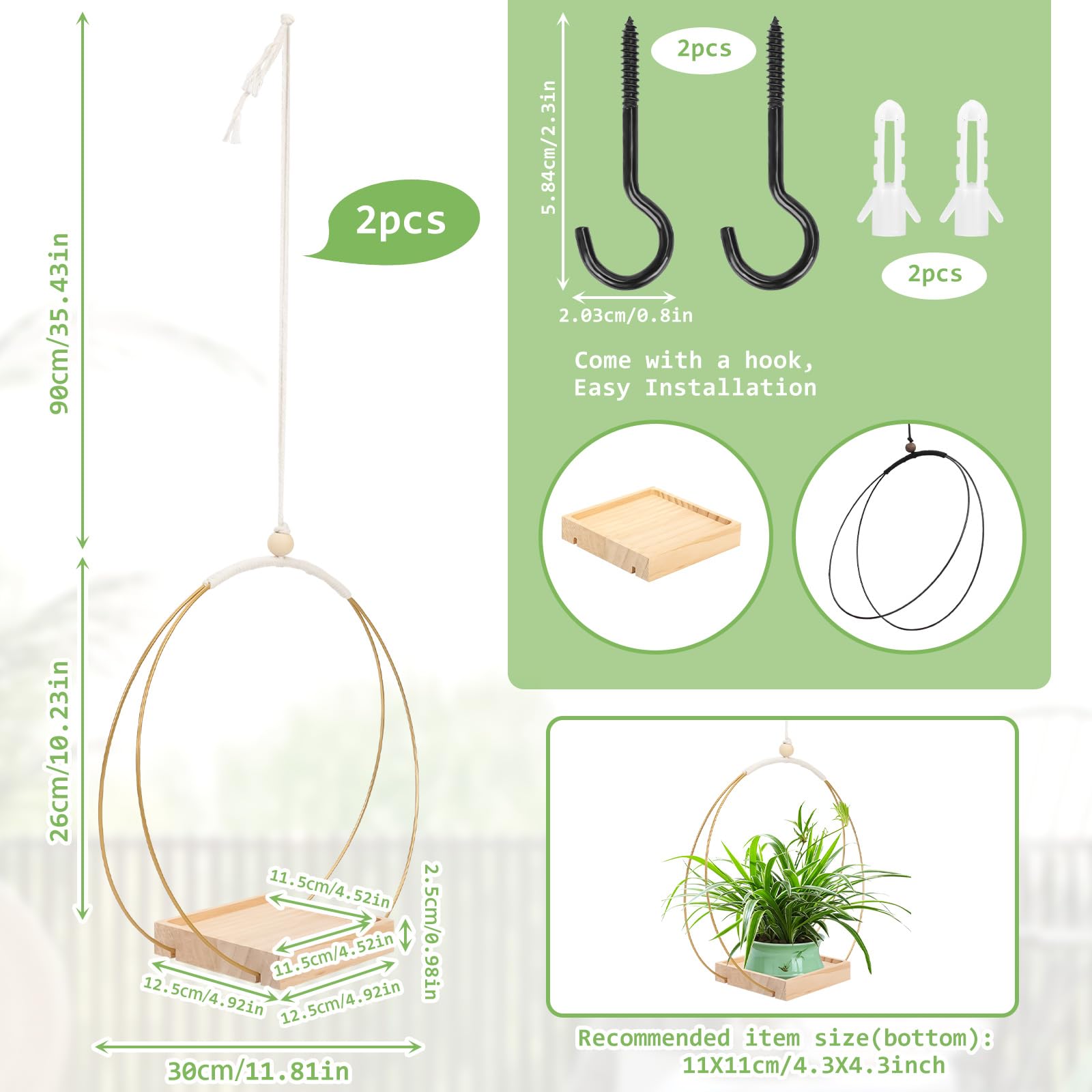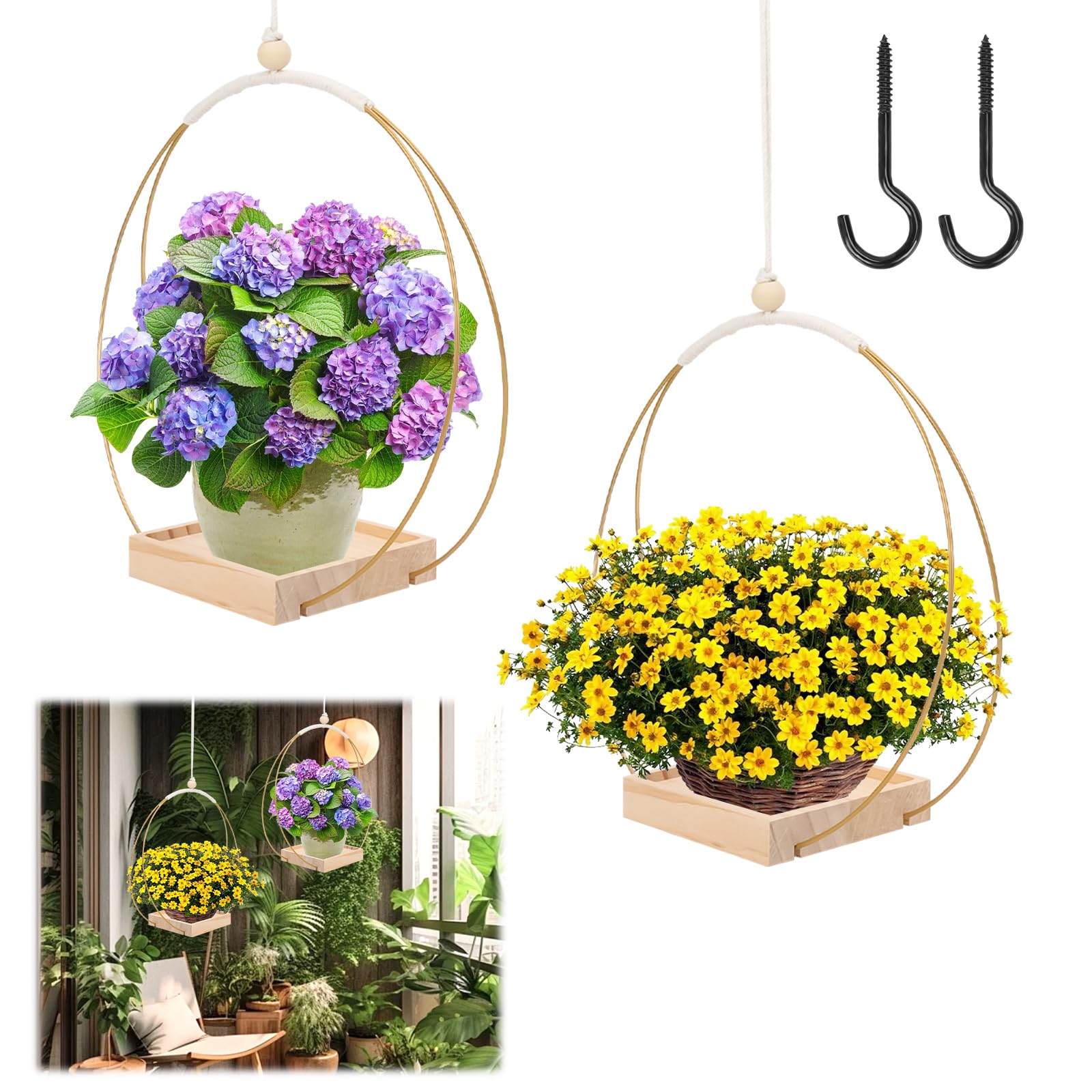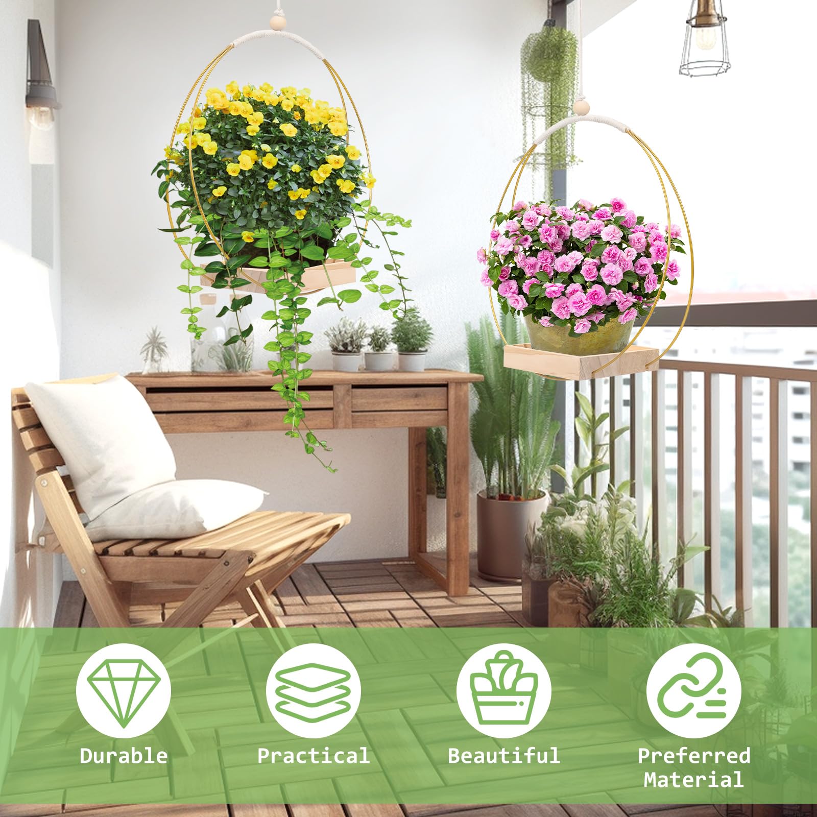 ハンギングプラントポット 植木鉢 2個セット ハンギングプランター 吊り下げプランター 吊り鉢 木製ベース 金属リング付き 観葉植物 おしゃれ 吊りプランター 耐荷重10kg 取り付け簡単 リビング ガーデン ベランダ 室内 屋外 (ゴールド(木色ベース))
