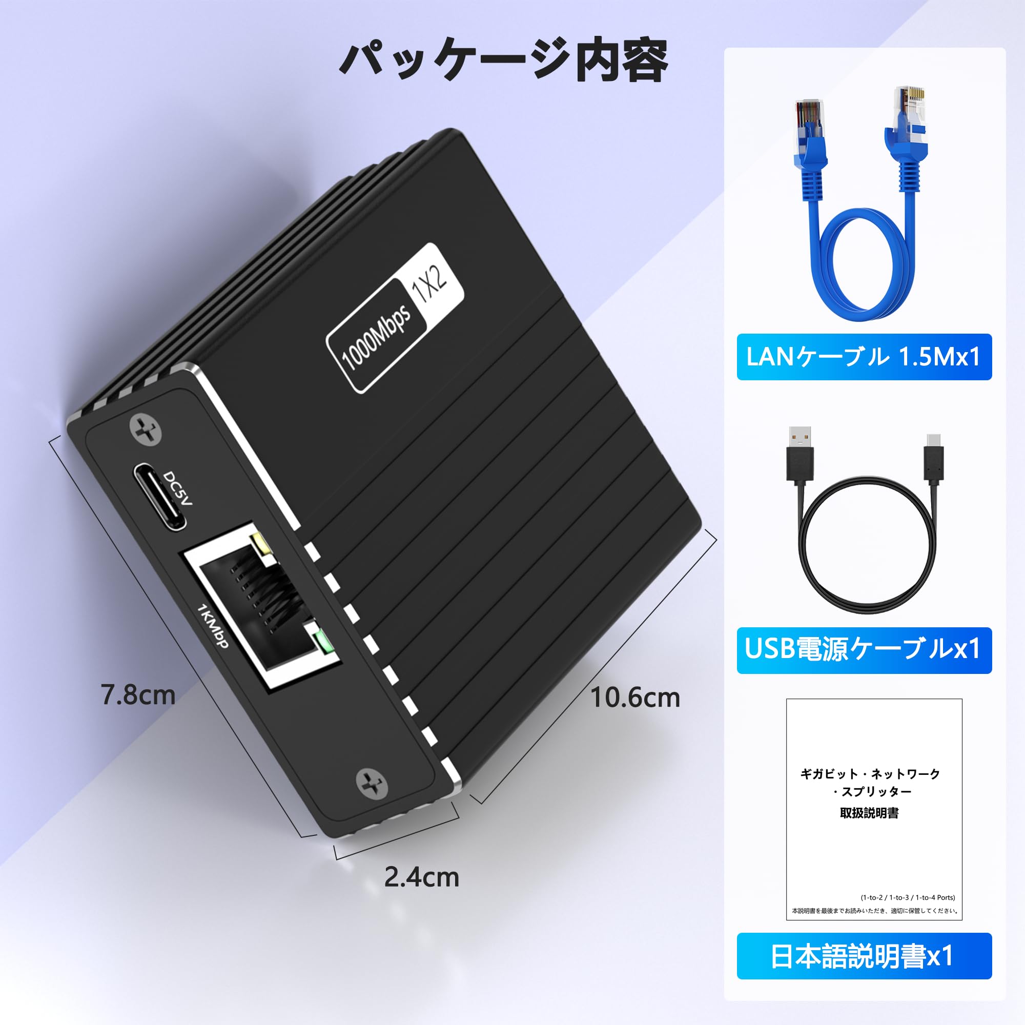 スイッチングハブ LAN ハブ 1入力2出力 Cat6ケーブル付き(1.5m) LAN 分配器 RJ45 高速1000Mbps ネットワーク分配器 2台同時使用 Cat5/Cat5e/Cat6/Cat7/Cat8対応 ネットワーク拡張 二股同時出力 有線中継器 Switch/PS5/PS4に対応