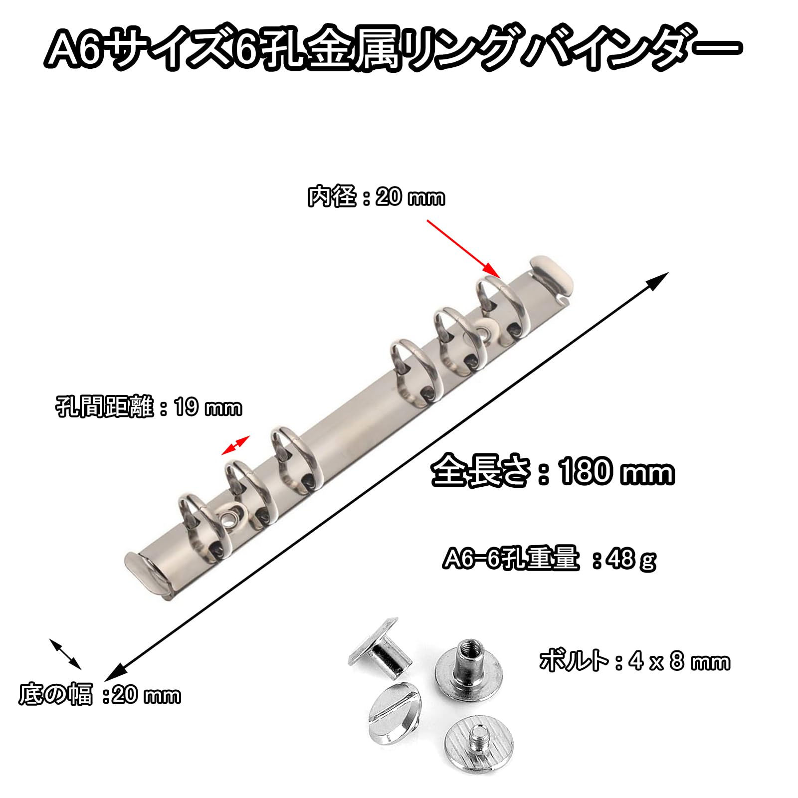 A6 多穴式リング バインダー金具 背なしタイプ 6穴【A6-6-20/20】20mm×180mm リング内径20mm 鉄ニッケル鍍金 シルバーシカゴスクリュ付き 手帳 製本 (A6-6穴)