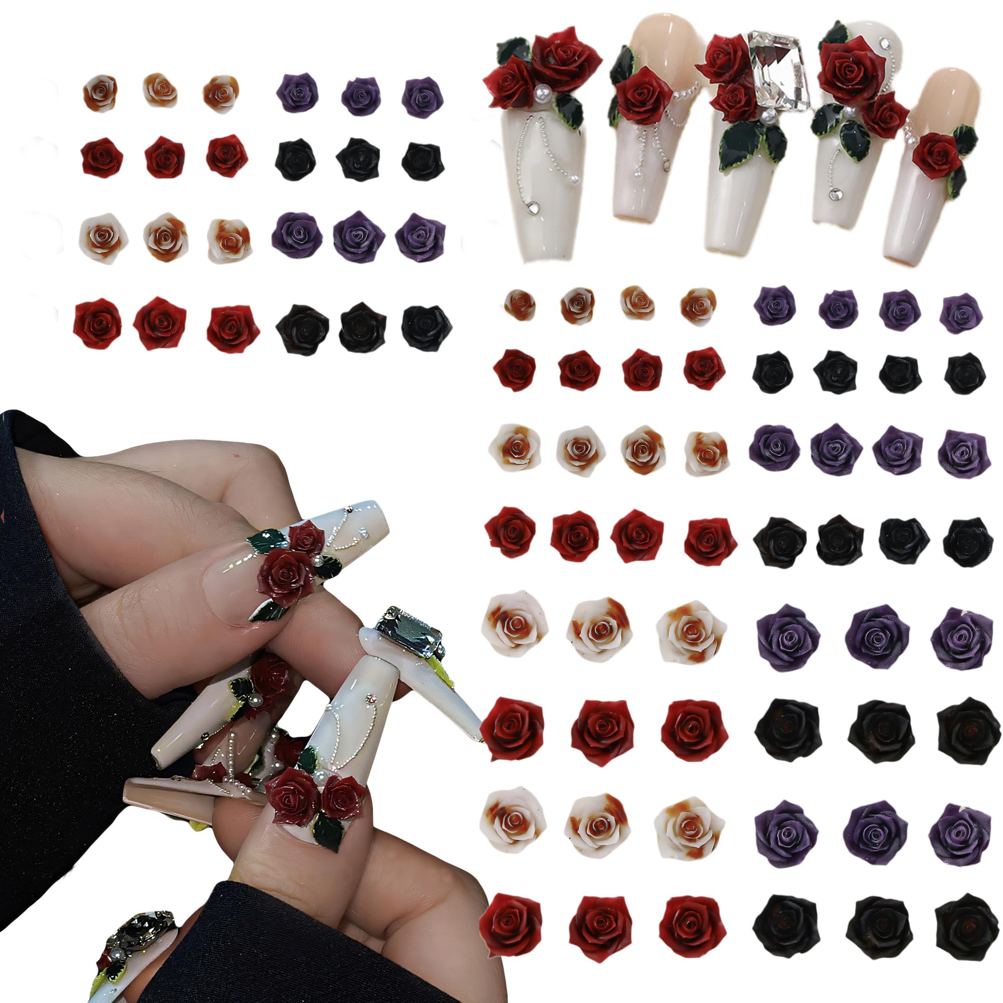 80個セットの3D立体ネイルパーツ - ローズとツツジ花リボン、ネイル飾り 手作り樹脂ジュエリーパーツ、3サイズネイルアートデコネイル パーツ、4色混合DIYハンドメイド ボウタイ キュート レジン パーツ (I)