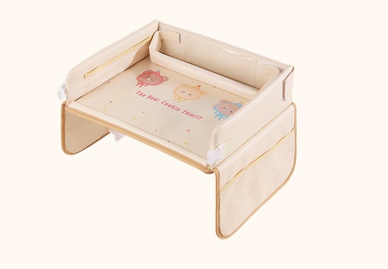 TerraShine チャイルドトレイ 車用チャイルドシートトレイ ベビーテーブル キッズテーブル 折りたたみ式 塗り絵 食事遊び 読書 収納 メッシュポケット 持ち運びやすい 固定バンド付き 子供用 後部座席 (ベージュ)