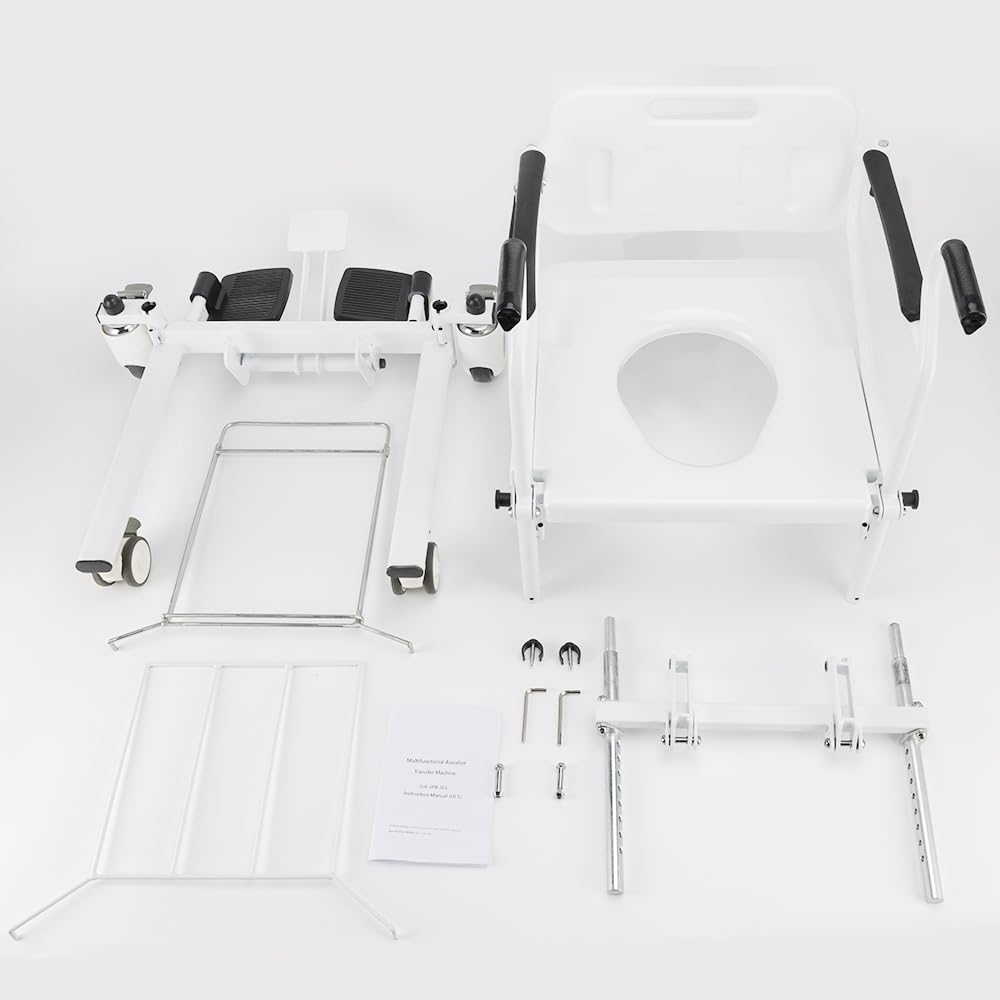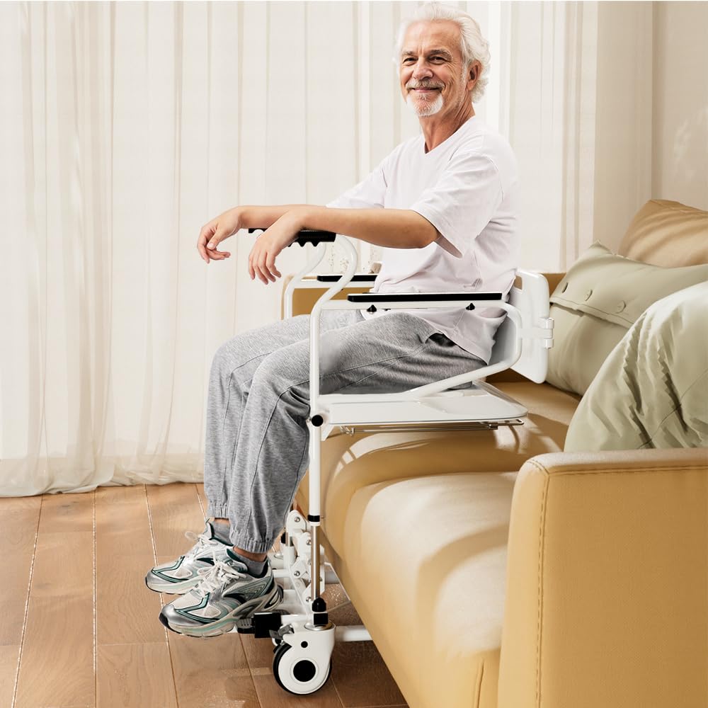 Frezon 介護アルミニウム合金昇降式車椅子 4 機能一体型(車椅子・シャワーチェア・便座機能・移乗補助)最大耐荷重 120kg 防水設計 工具不要組立 介護用 在宅用 オープンバック & 肘掛け 360° ステアリング ポータブル便器付き