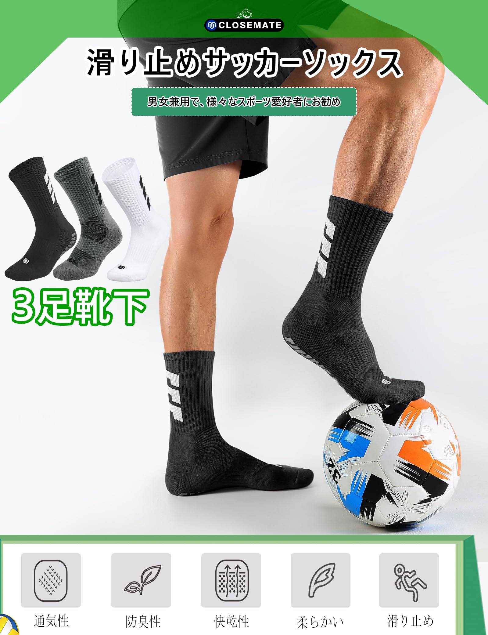 [CLOSEMATE] 靴下 サッカーソックス メンズ 滑り止めソックス 防臭吸汗 フットサル スポーツ用 3足 フットボール ヨガ 吸湿速乾 グリップソックス バスケットボール ハイキング ランニング