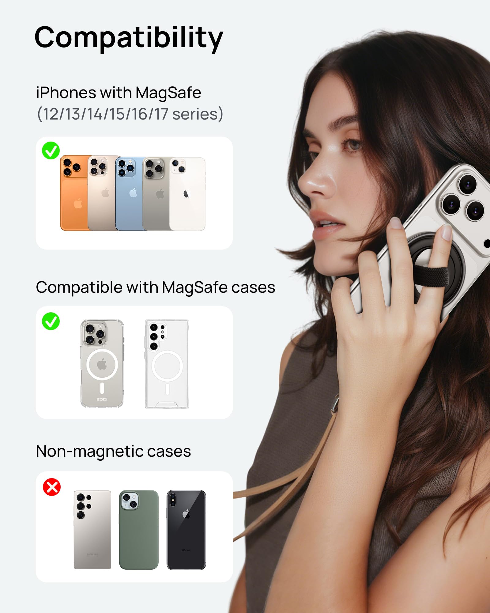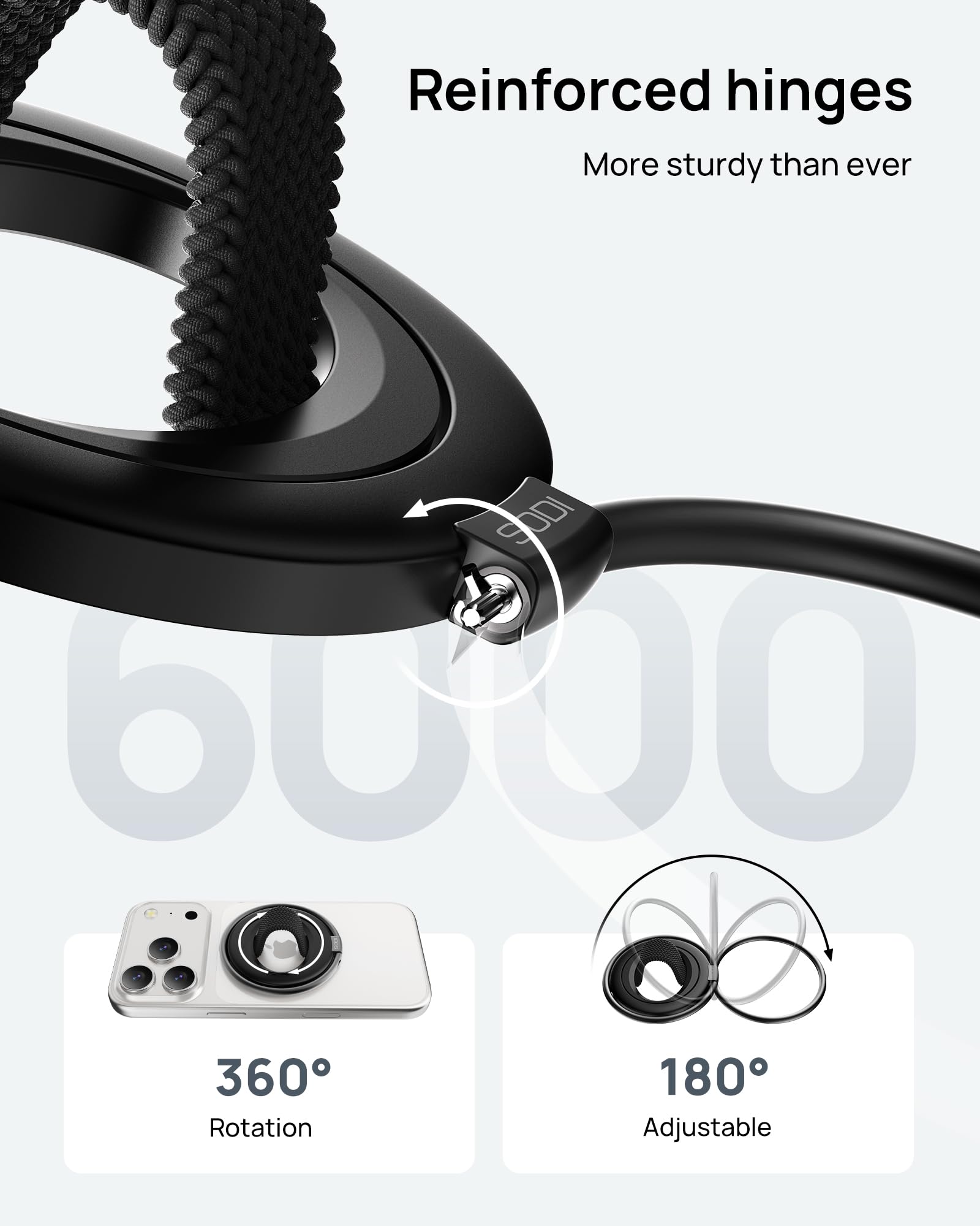 【マグネット・強力磁石】SODI スマホリング&スタンド MagSafe対応 360度回転・180度反転 マグセーフ MagSafe リング 薄型 軽量 マグネット式 磁石 簡単着脱 スマホ落下防止 指かけタイプ iPhone 16/15/14/13/12 Pro Max&Androidシリーズなどに対応 テーブル 金属リング付き ストラップ付き ブラック