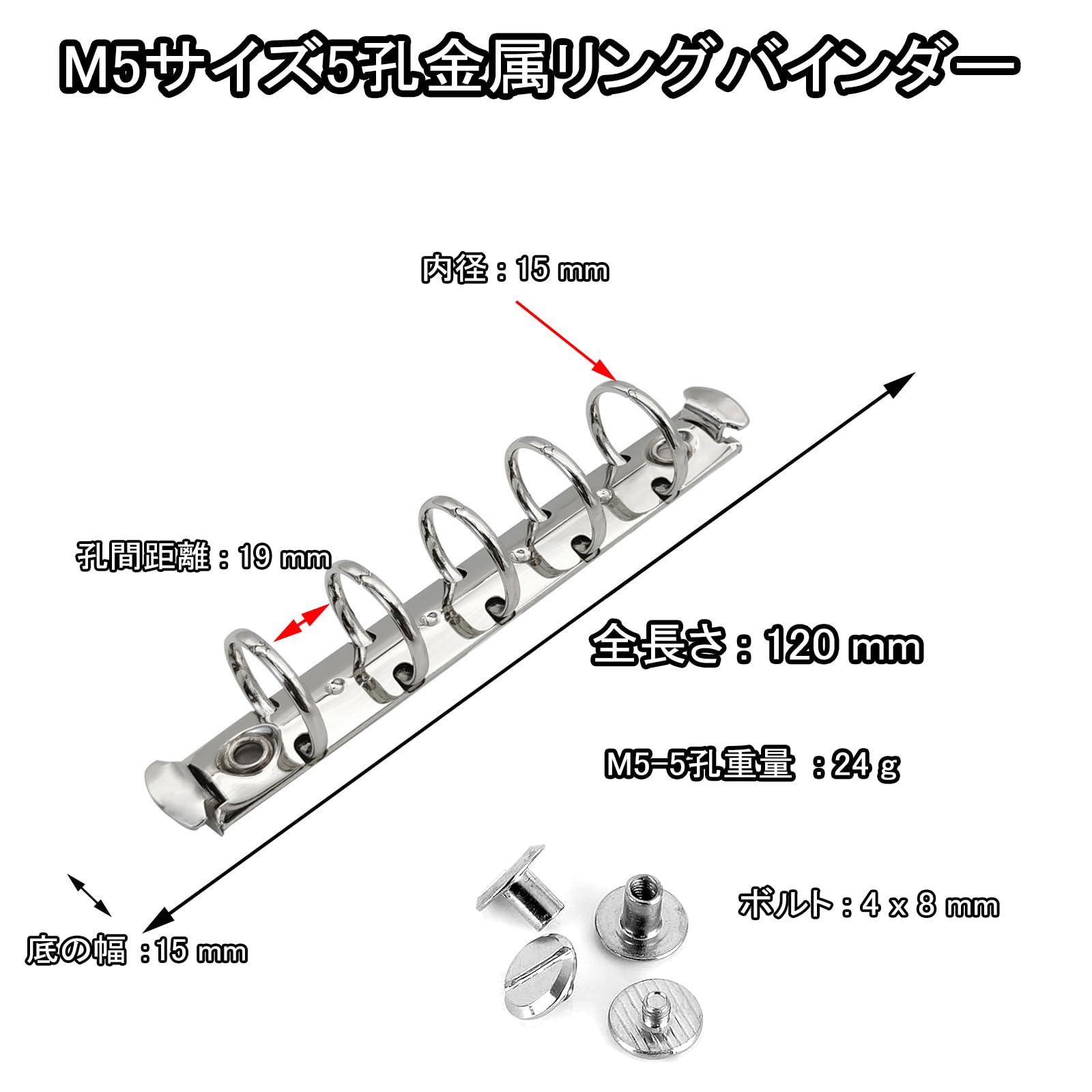 Virtarlux M5 多穴式リング バインダー金具 背なしタイプ 5穴【M5-5-15/15】15mm×130mm リング内径15mm 鉄ニッケル鍍金 シルバーシカゴスクリュ付き 手帳 製本 (M5-5穴)