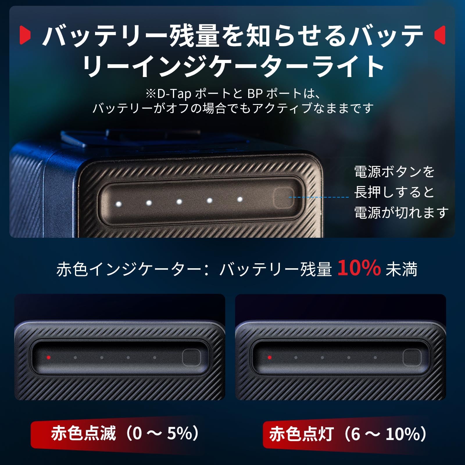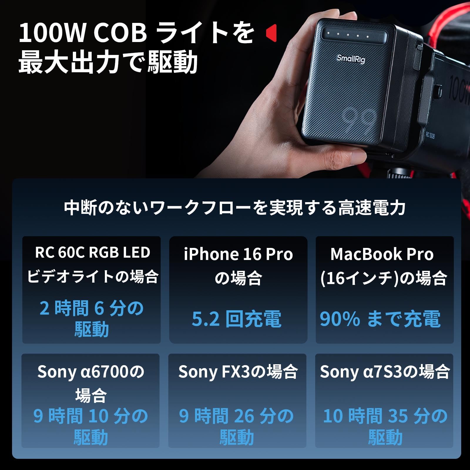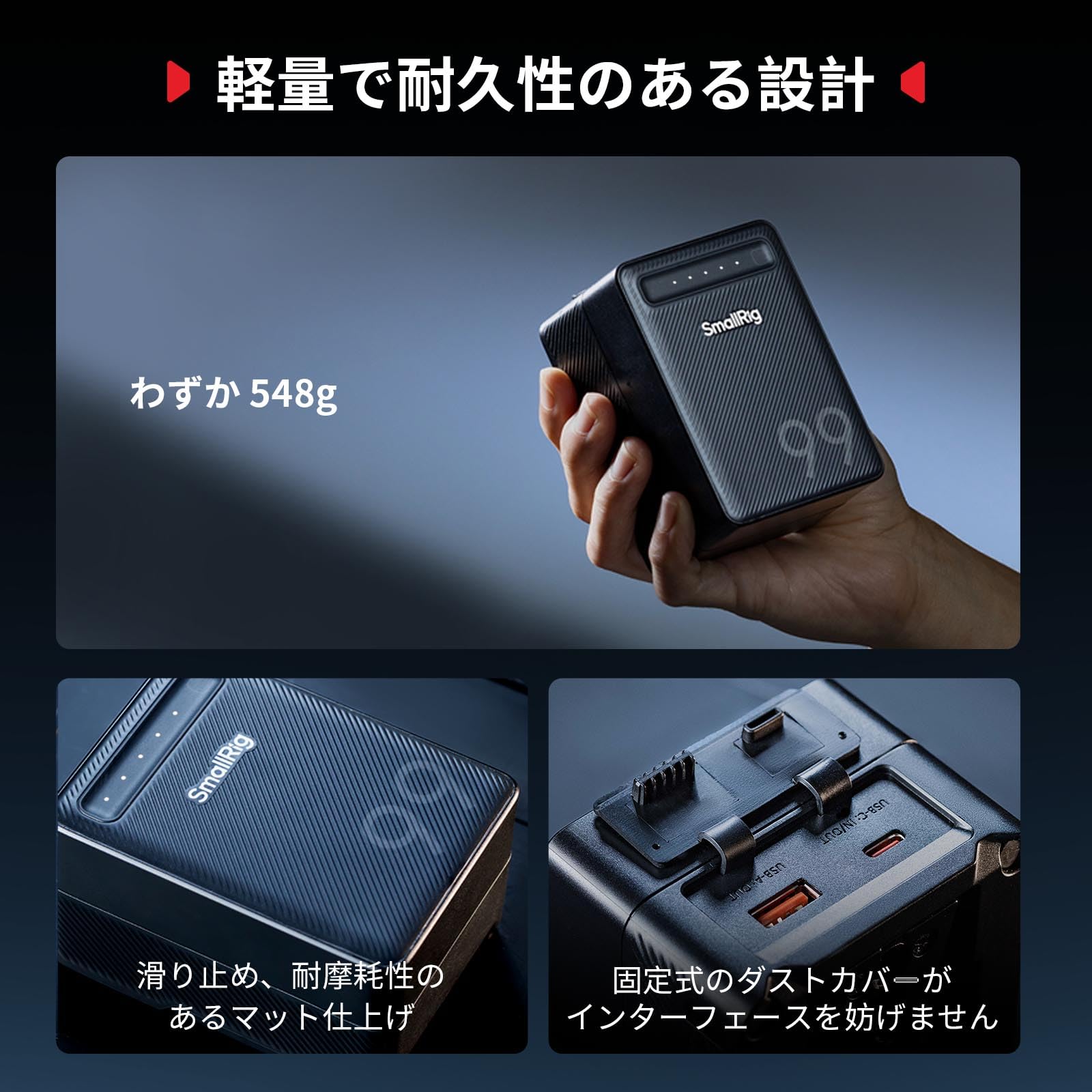 SmallRig VB99 Lite ミニ V マウント バッテリー5245は、プレミアムLG大容量セルを採用し、安全で安定した充放電体験を提供し、堅牢で現実的な電力出力を保証します。内蔵のBMSインテリジェント制御チップと8つのインテリジェント保護機能は、電流、電圧、温度をリアルタイムで監視し、デバイスに包括的な安全性を提供します。4つのコア電源ポート(1 BP + 1 D-Tap + 1 USB-C + 1 USB-A)を装備し、ミラーレスカメラ、カメラ、写真用照明、モニターなど、幅広いデバイスの電力ニーズに容易に対応します。5つのLEDインジッチボタンケータとタは、アクティブな低電池アラートを提供し、操作をシンプルで直感的にし、予期しない停電を防ぐために一目でわかる電池状態を提供します。PD3.0 65W双方向急速充放電技術をサポートし、わずか3時間でフル充電し、60W COBライトをフルパワーで駆動することもでき、迅速なリサイクルと完全なバッテリー寿命を保証します。高度に統合されたデザインにより、重量はわずか550g。コンパクトで軽量な設計は、モバイル撮影時の負担を大幅に軽減し、クリエイターにとってより快適で快適な撮影を実現します。上部に巧みに設計された位置決め溝により、ダストカバーの取り付けやポートの抜き差しが簡単に行えます。内側から外側まで、しっかりとした堅牢性を備え、あらゆる瞬間を自信を持って捉えることができます。互換性ミラーレスカメラ、ビデオカメラ、ビデオモニター、フォローフォーカスデバイス、画像伝送システム、フィルライト、携帯電話、タブレット、ノートパソコンなどに対応同梱物VB99 Lite Mini Vマウントバッテリー × 1取扱説明書 × 1ユーザーマニュアル × 1製品仕様材質:耐火PC + シリコンバッテリータイプ:リチウムイオンバッテリーバッテリー定格:14.54V / 6800mAh / 99Wh定格出力:100W入力:USB-C 5V⎓3A、9V⎓3A、12V⎓3A、15V⎓3A、20V⎓3.25A 65W(最大)BP/D-Tap:11.2~16.8V⎓6.8A(最大)出力:USB-C 5V⎓3A、9V⎓3A、12V⎓3A、15V⎓3A、20V⎓3.25A;65W(最大)USB-A 5V⎓3A、9V⎓3A、12V⎓2A; 27W(最大)BP/D-Tap 11.2~16.8V⎓6.8A(定格)USB-C対応プロトコル:PD3.0、QC2.0、QC3.0、PPS、AFC、FCP、SCP、DCP-1.5A、APPLE-2.4AUSB-A対応プロトコル:QC2.0、QC3.0、AFC、FCP、SCP、DCP-1.5A、APPLE-2.4A放電カットオフ電圧:11.2V充電温度:0℃~45℃放電温度:-15℃~60℃充電ポート:BP、D-Tap、USB-Cボタン機能:電源オン/バッテリーチェック:シングルクリック電源オフ:3秒間長押し(電源オフ時はUSB-C、USB-A、ディスプレイのみがオフになります)ライトは点灯しますが、BP ライトと D-Tap ライトは消灯しません。LED インジケーター機能:放電/バッテリーチェック:5 つの LED。充電回復温度は5℃~40℃、放電回復温度は-10℃~55℃です。)製品重量:548±10g製品寸法:100.9×73.4×56.3mm梱包重量:688±10g梱包寸法:146×113×74mm