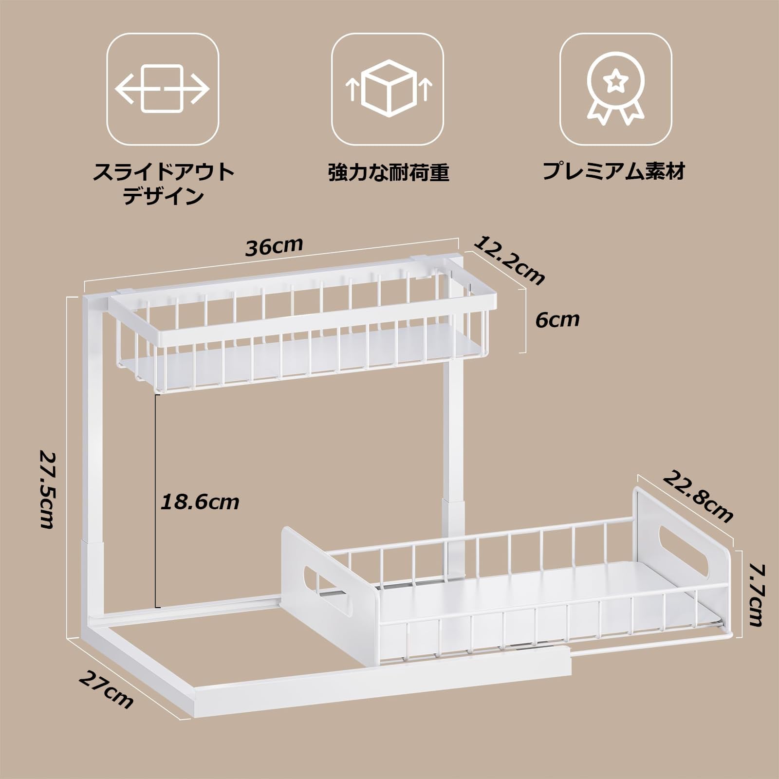 シンク下収納ラック 洗面台下収納 キッチンシンク下収納ラック 収納バスケット付 2段 伸縮 組み立て簡単 省スペース 伸縮棚 横幅調整可能