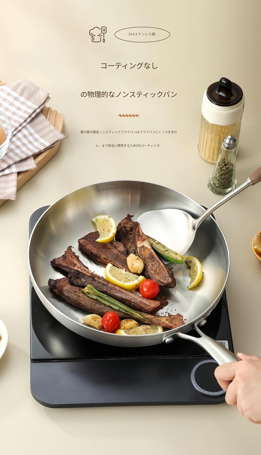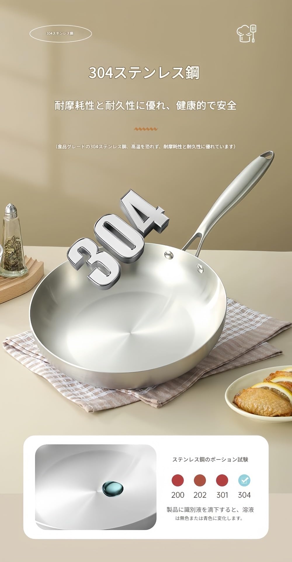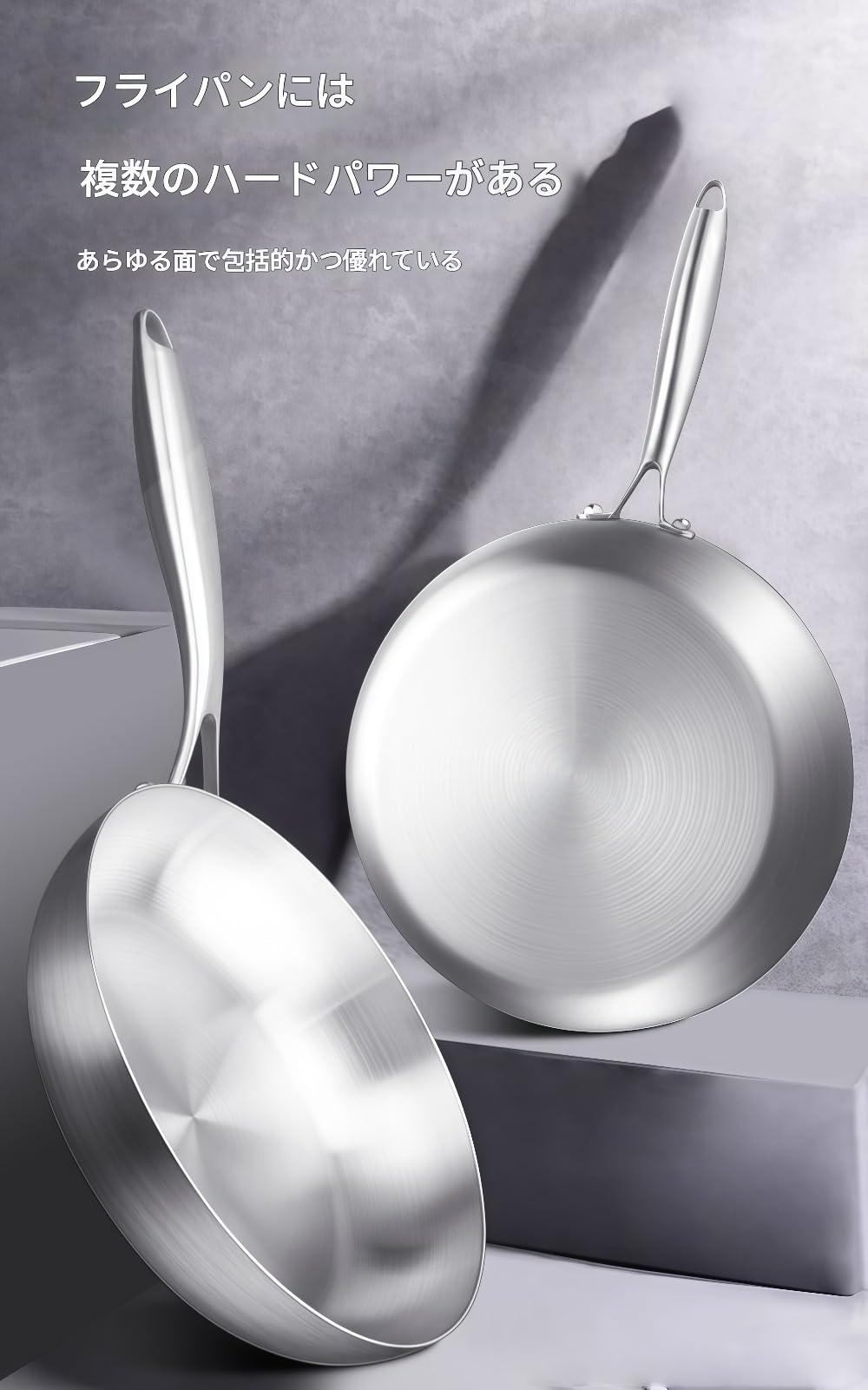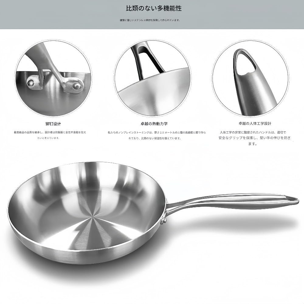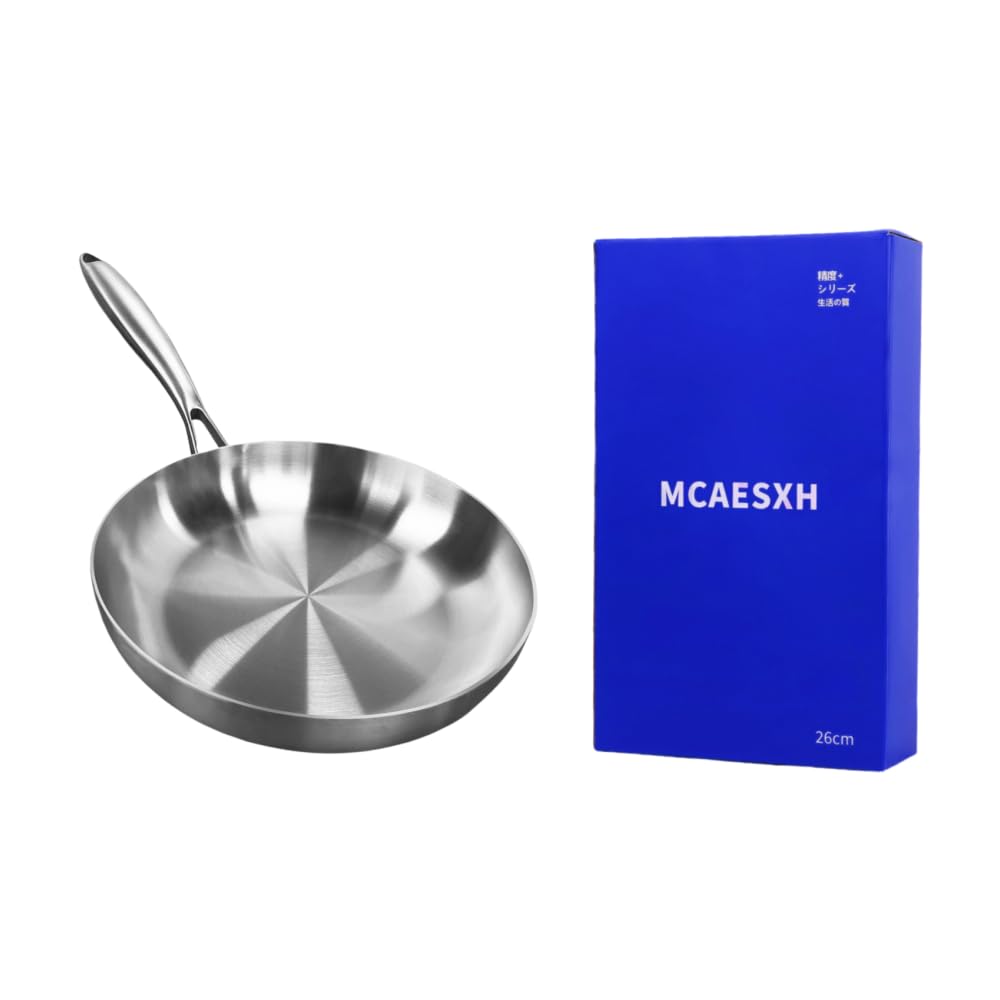 MCAESXH ステンレス製フライパン、極厚3層構造家庭用フライパン、コーティングなしシェフ、ステーキ、目玉焼き用焦げ付きにくい、IH・ガス・オーブン対応食器洗い機対応、ギフトボックス包装新築祝い、無料メンテナンスガイド付属高級キッチン用品、10年品質保証 (26cm)
