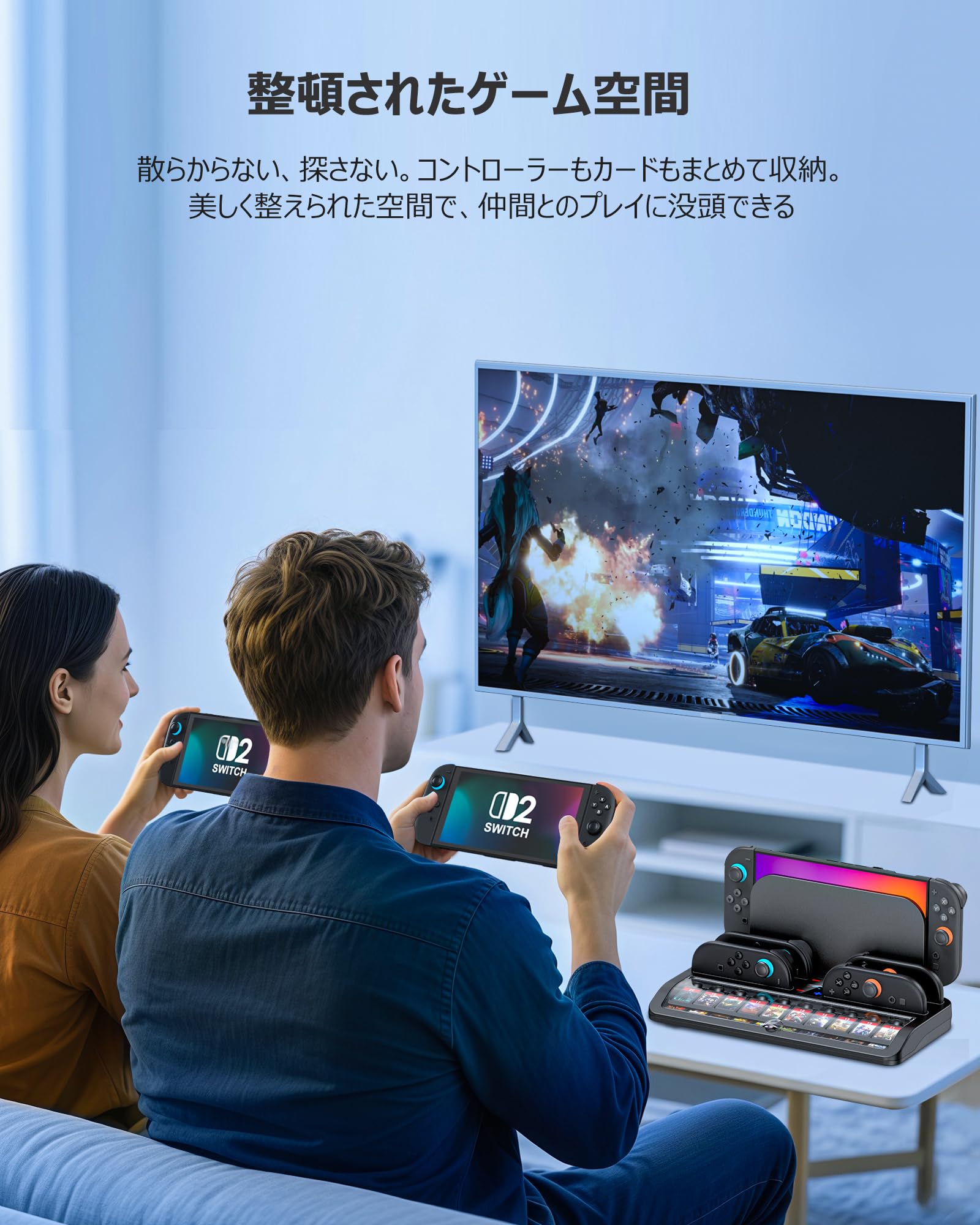 Switch2充電スタンド【Switch 2対応充電収納一体型】スイッチ2ジョイコン用充電ドック 4in1同時急速充 20枚ゲームカード/Switch2の本体収納&保護可能 簡単取付 ジョイコン左右同時充 電ゲーム機 LED指示ランプ付き 省スペース設計 折りたたみ式