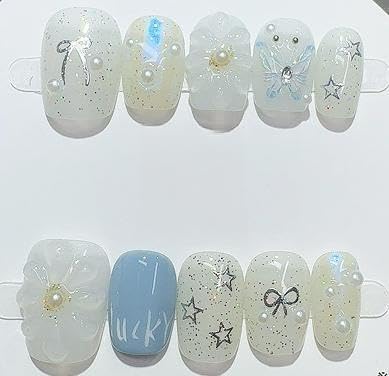GLORS | Ballerina Press-on Nails, Long Length, Pinky Design with Silver Bowknot, 10 Pieces (M, LB)