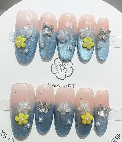 GLORS | Purly Handmade Long Ballerina Press on Nails | Blue and Yellow False Nail with 3D Flower in Island Holiday Style | Salon Quality Long Nail, 10 Pieces (L, LC)