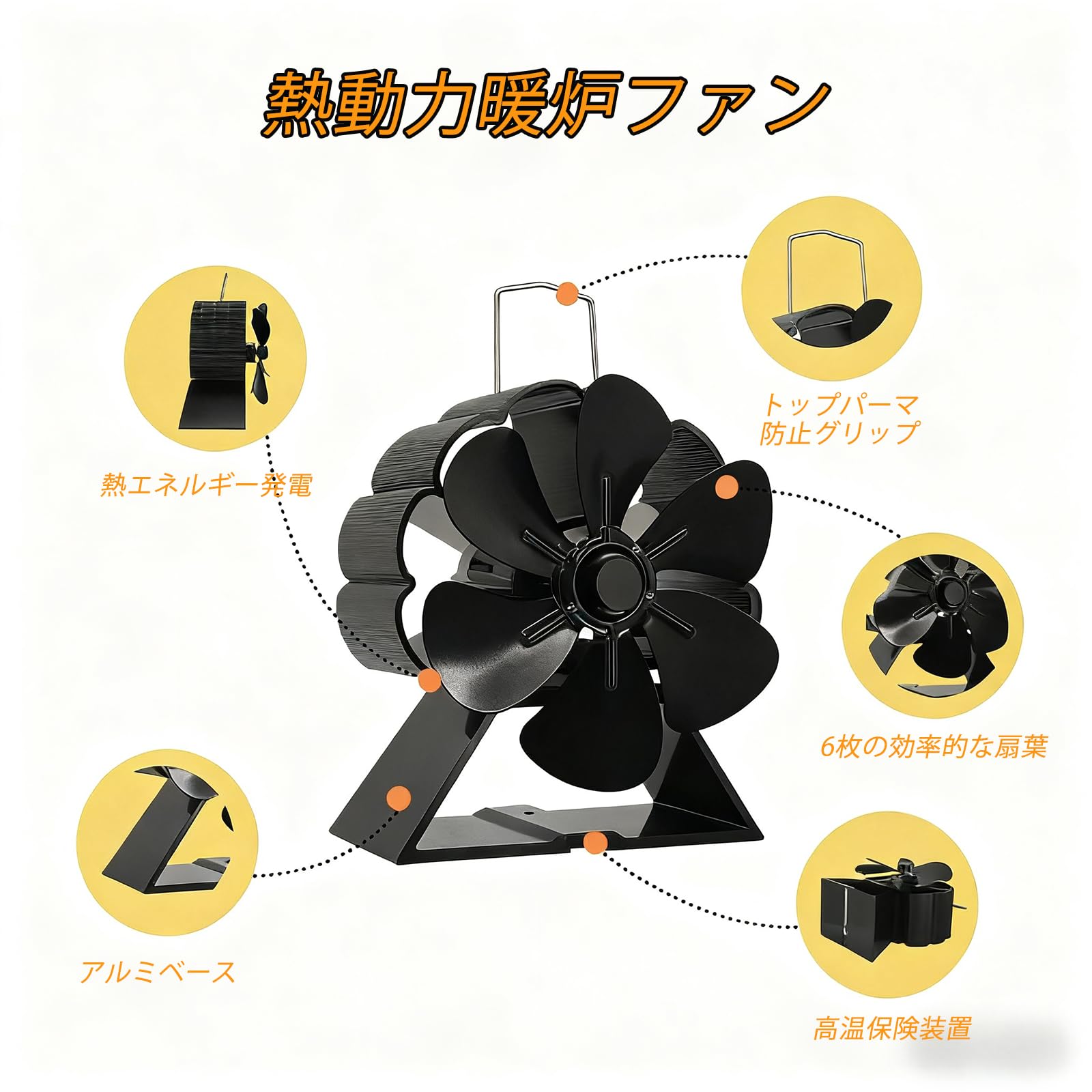 QIYUNI ストーブファン 電源不要 静音 エコファン 6枚羽ブレード 火力熱炉対応 薪ストーブ/暖炉用 省エネ 付き 防寒対策 暖房機器 (黒)