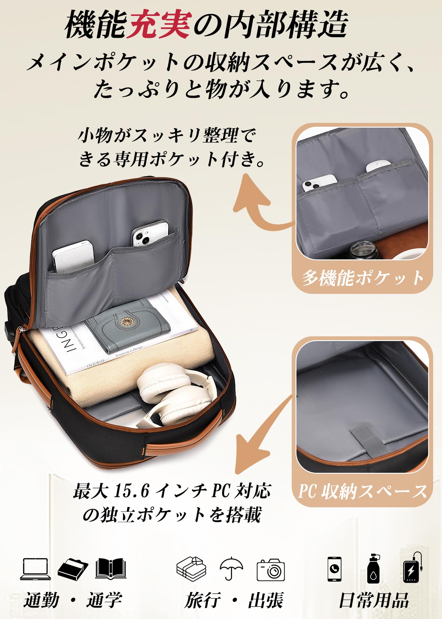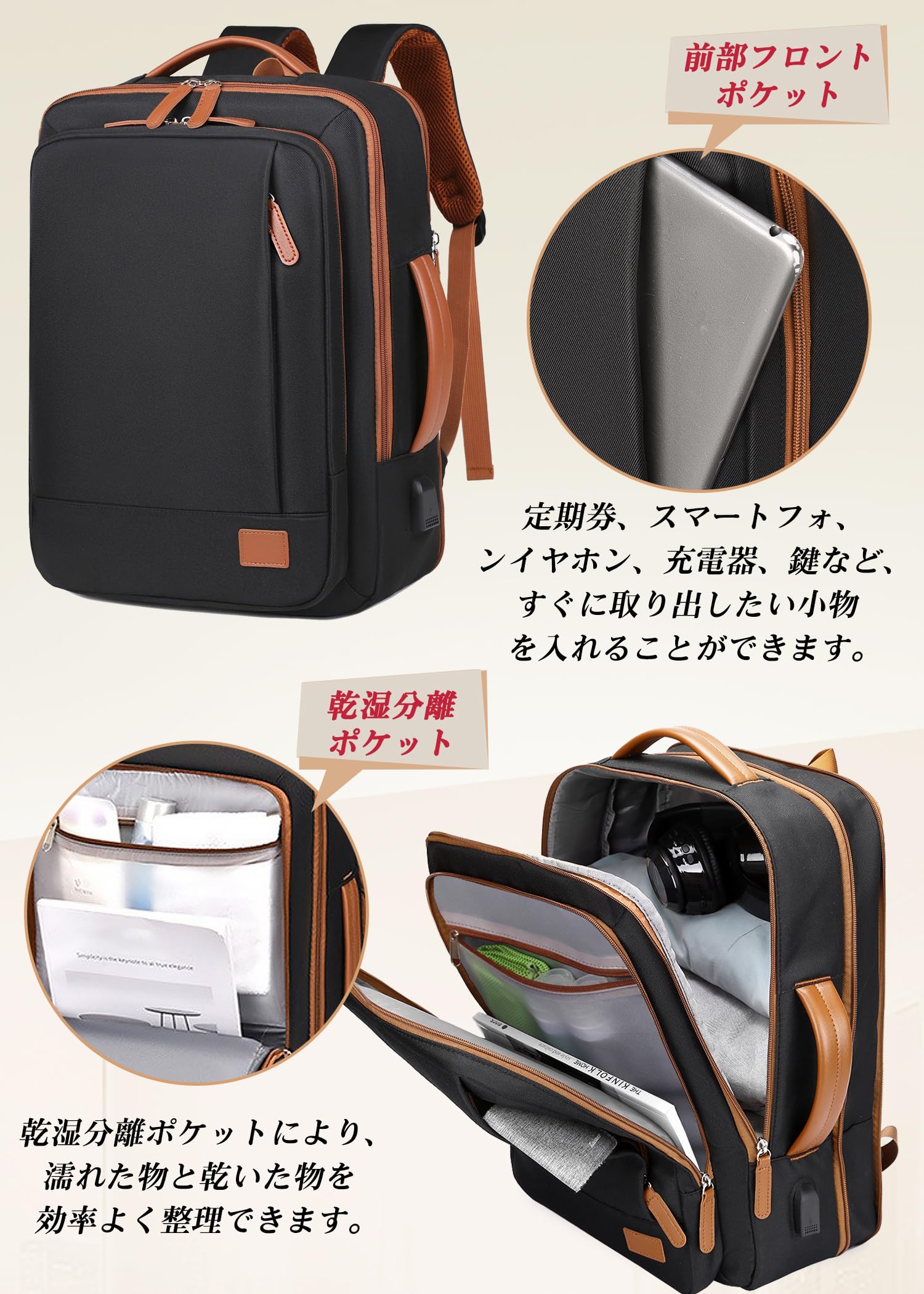 [Pacapet] リュック レディース 大容量 旅行 ビジネスリュック 30L バックパック リュックサック 軽量 人気 撥水加工 充電ケーブル通し穴 PC バッグ 3WAY マチ拡張 乾湿分離 収納多ポケット 通勤 通学 出張 アウトドア ベージュ