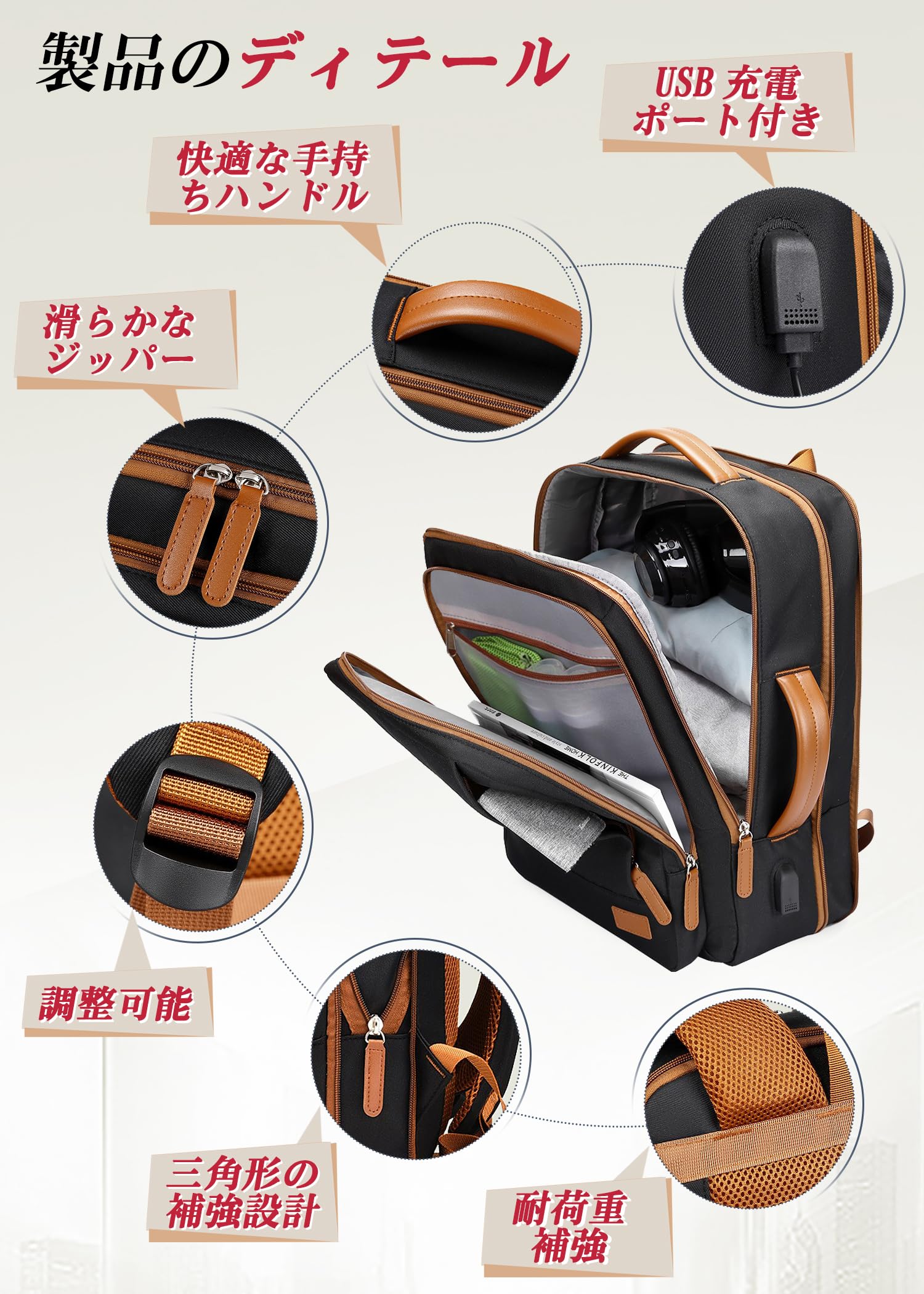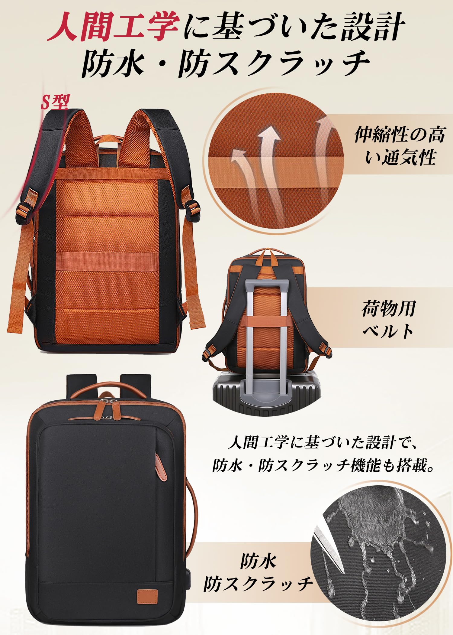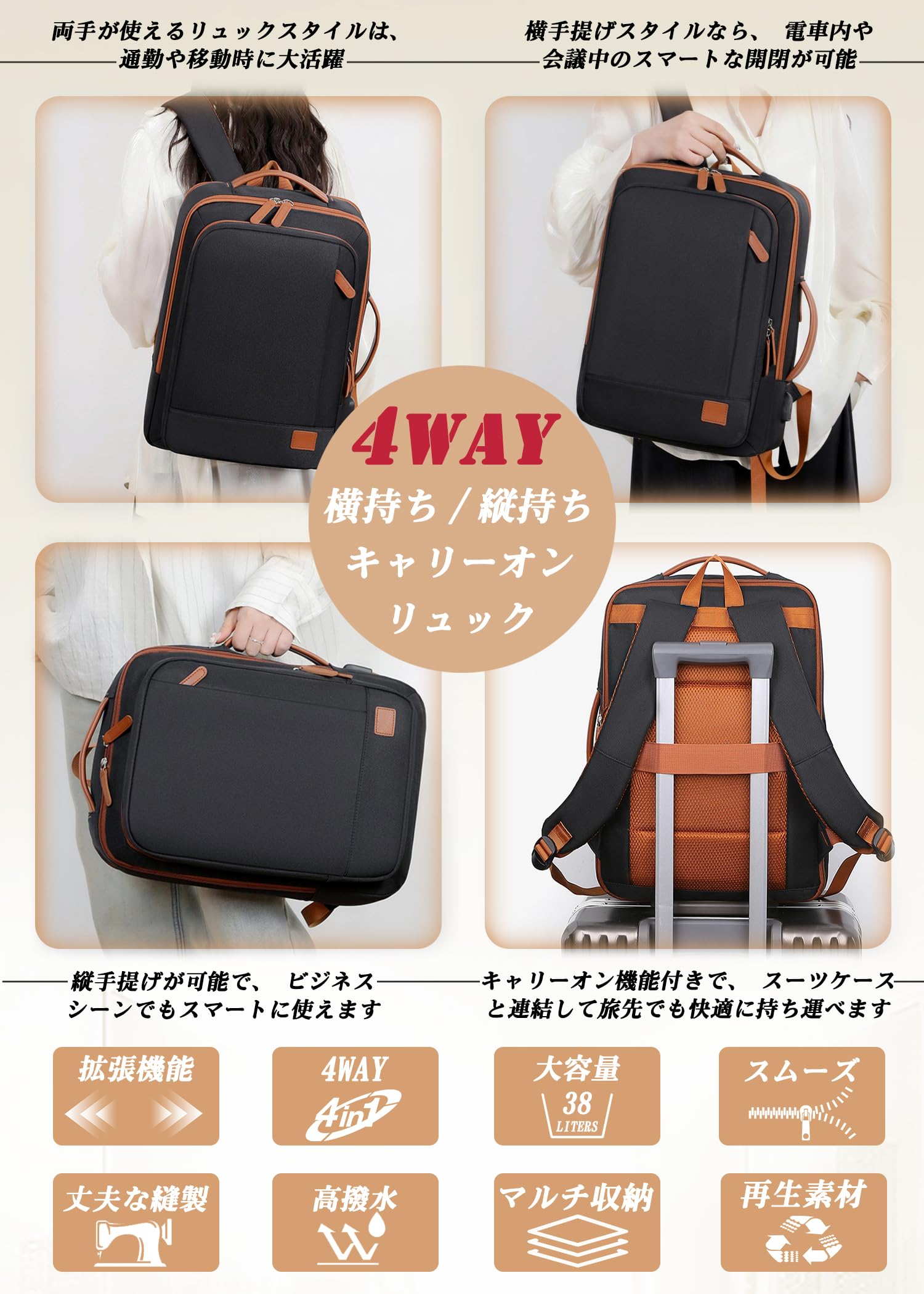 説明【30L・大容量・拡張可能】サイズ:43x33x14cm(拡張前:20L)、43x 33 x 20cm(拡張後:30L);機内に持ち込み可能です。拡張機能を備えたこのリュックは、必要に応じて収容量をアップ可能。通勤・旅行などシーンに合わせて、使い勝手自在です。20L〜30Lの容量調節が可能な拡張設計。少ない荷物の日も、長旅の時も安心して使えます。【4WAY・ビジネスリュック】1つのバッグで4通りの使い方に対応し、さまざまなライフスタイルにフィットします。両手が使えるリュックスタイルは、通勤や移動時に大活躍。横手提げスタイルなら、電車内や会議中のスマートな開閉が可能。縦手提げが可能なデザインで、ビジネスシーンでもスマートに使えます。キャリーオン機能付きで、スーツケースと連結して旅先でも快適に持ち運べます。【多ポケット・多収納設計】多収納設計と豊富なポケットで、必要なものをスムーズに取り出せる!ビジネスや通学にも最適な機能的リュック。全7ヶ所の収納スペースで整理整頓がラクラク。前部フロントポケット*2、 乾湿分離ポケット*1、メインポケット*1、小分けボケット*2 ,PC収納スペース*1 。【多ポケット・乾湿分離ポケット・PC収納スペース】前部フロントポケット*2:定期券、スマートフォ、ンイヤホン、充電器、鍵など、すぐに取り出したい小物を入れることができます。乾湿分離ポケット:乾湿分離ポケットにより、濡れた物と乾いた物を効率よく整理できます。メインポケット:メイン収納部は大容量の設計で、通勤や旅行に必要な荷物を効率よく整理可能です。機能充実の内部構造:小物がスッキリ整理できる専用ポケット付き。PC収納スペース :15.6インチPC対応の独立ポケットを搭載。【滑らかなジッパー・USB充電ポート】高品質なジッパーを使用し、開閉がスムーズで引っかかりにくい設計。頻繁な使用でも耐久性に優れ、ストレスフリーな操作性を実現しています。ビジネスリュックの外側にはUSB充電ポートを備えており、歩きながらでもスマートフォンにすぐに充電でき、非常に便利です。に基づいた設計・快適な手持ちハンドル】肩へのフィット感を高めるため、長さが自由に調整可能なショルダーストラップを採用しています。使用者の身長や使用シーンに応じて最適な位置に調節でき、快適な背負い心地を実現します。上部に設けられたクッション入りハンドルが、手提げ使用時の握り心地を向上。短時間の持ち運びや持ち上げ時にも手に優しく、快適なグリップ感を提供します。【防水・防スクラッチ】高密度ポリエステルやナイロンなど、耐水性に優れた素材を採用しています。突然の雨や水しぶきにも強い構造で、バッグ内部を湿気や水分からしっかり保護します。大切な書類や電子機器も安心して収納可能です。底面や側面など摩耗しやすい部分には、強化素材や耐摩耗性の高い生地を使用。また、表面加工により、小さな傷が目立ちにくく、長期間にわたって美しい外観を維持できます。