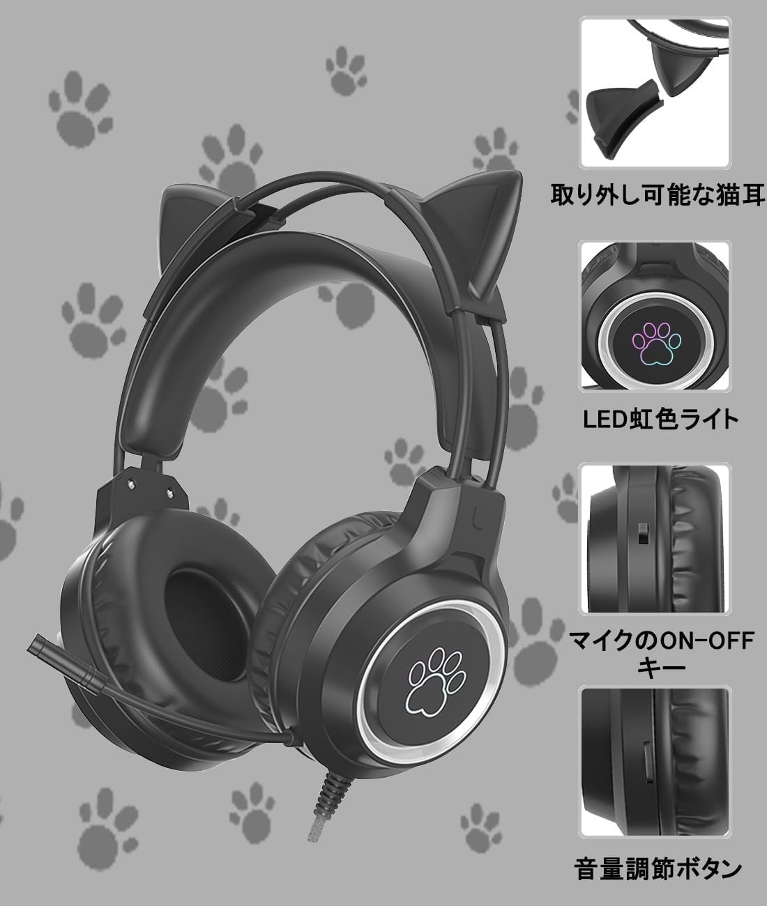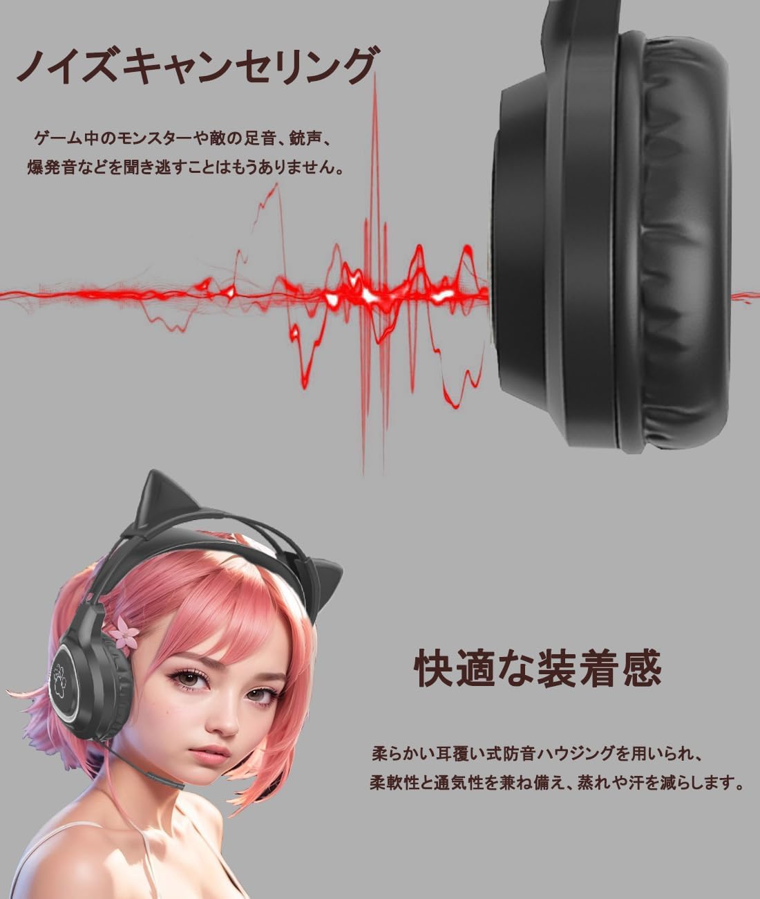 GHDVOP 猫耳ヘッドホン ヘッドフォン ゲーミングヘッドセット ゲームヘッドホン 有線ヘッドフォン オーバーイヤーヘッドホン 可愛い 3.5mm 有線 マイク付き 40mmスピーカー 密閉型 立体音響 遮音 軽量 折りたたみPS4Pro /PS5/PC/Switch Xbox One S/X スマートフォン クリスマス 誕生日 新年プレゼント ハロウィン 日本語説明書付き (ブラック)