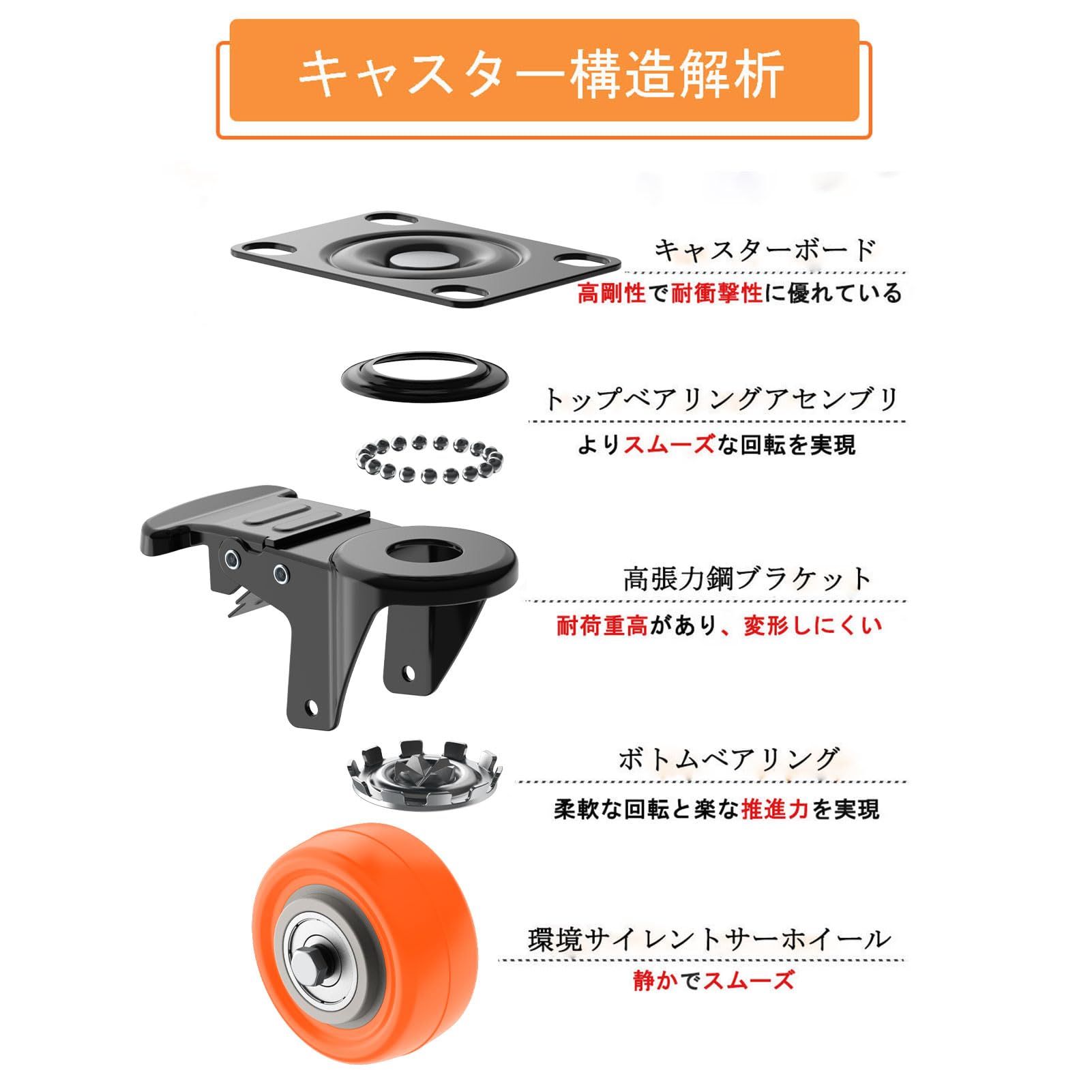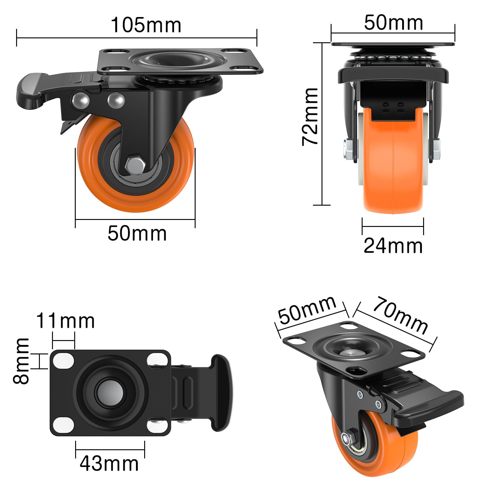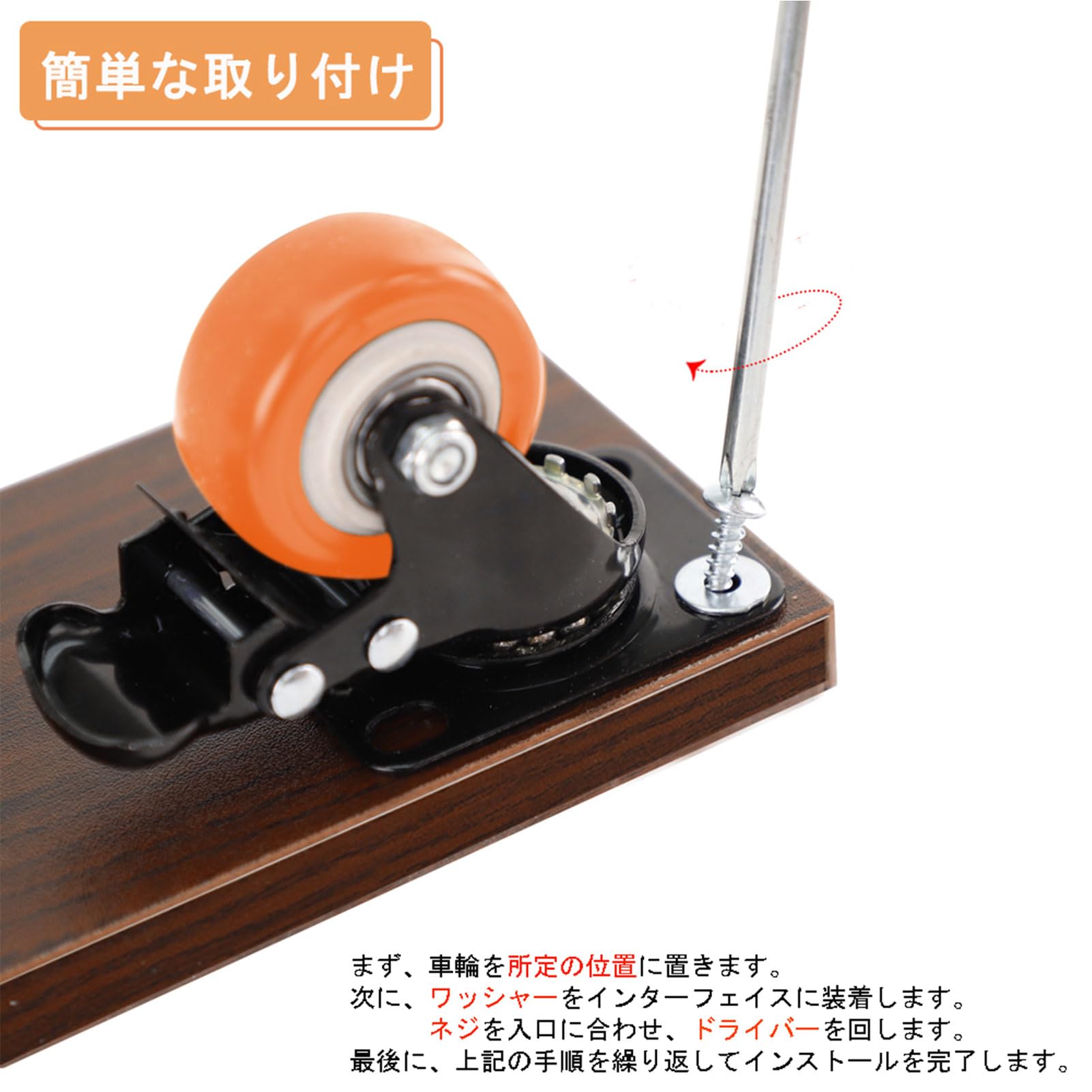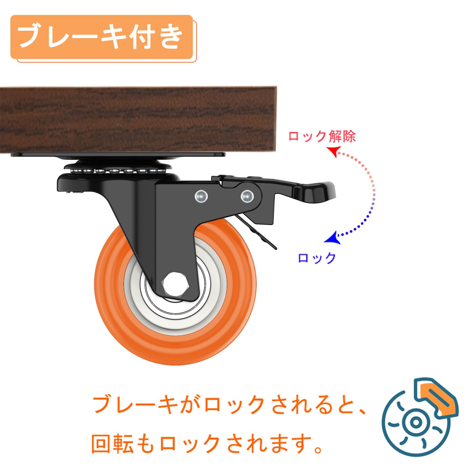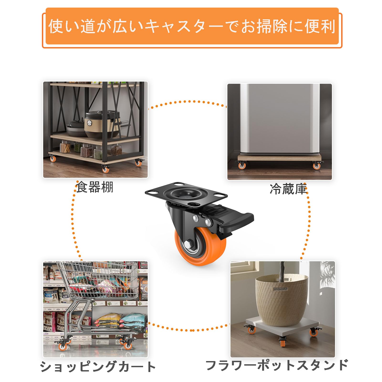 DEWEL プレート キャスター 車輪 交換 台車 静音 ストッパー付き 2インチ ゴム ウレタン 50mm 後付け 家具 交換キット 自在 360度回転 DIY 4個セット 総耐荷重120kg ブレーキ付き スムーズ 移動 (オレンジ)