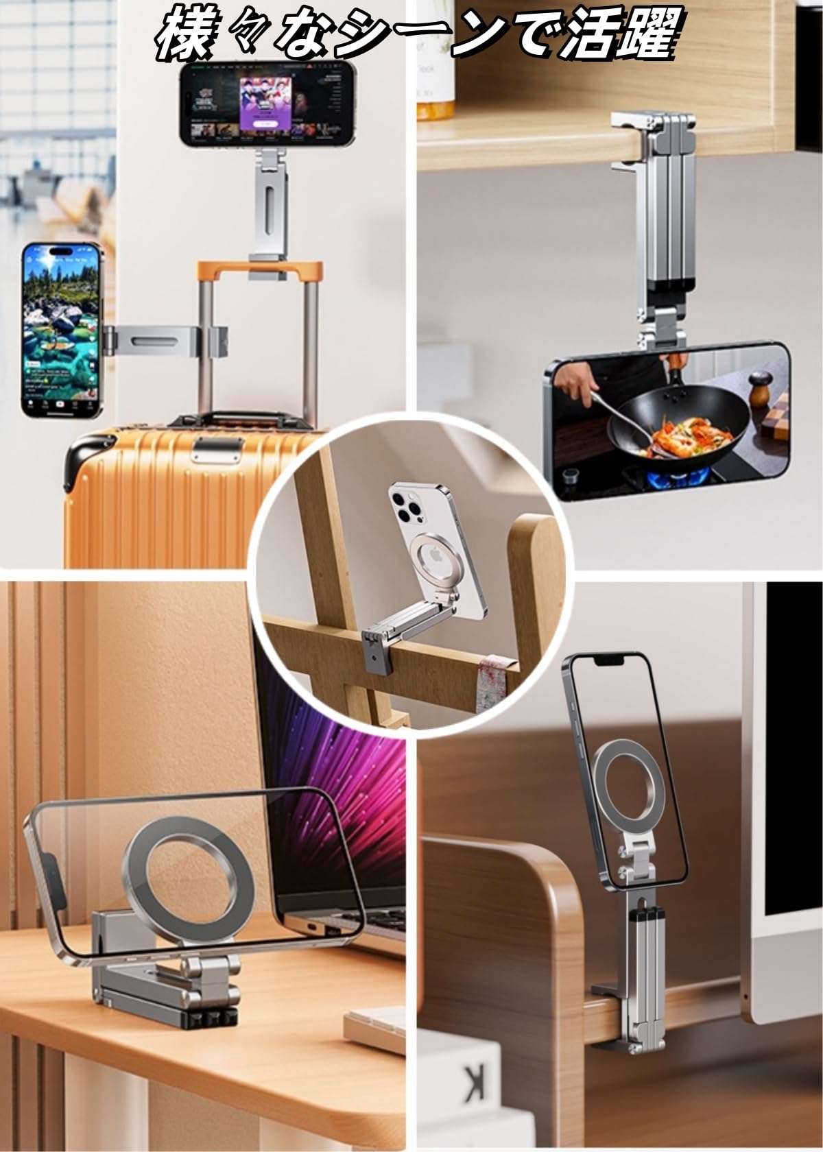 【2025年最新】スマホスタンド 卓上 マグネット 角度調整 寝ながら 360度回転 撮影 magsafe対応 高さ調整(29cm-84cm)伸縮性 折りたたみ 高さあり コンパクト マグセーフ対応 強力 アームスタンド スマホ撮影 片手操作 アルミ合金 広い可動域 省ベース iPhone/Android全機種対応 俯瞰/手元/動画撮影/ライブ配信 滑り止め 落下防止